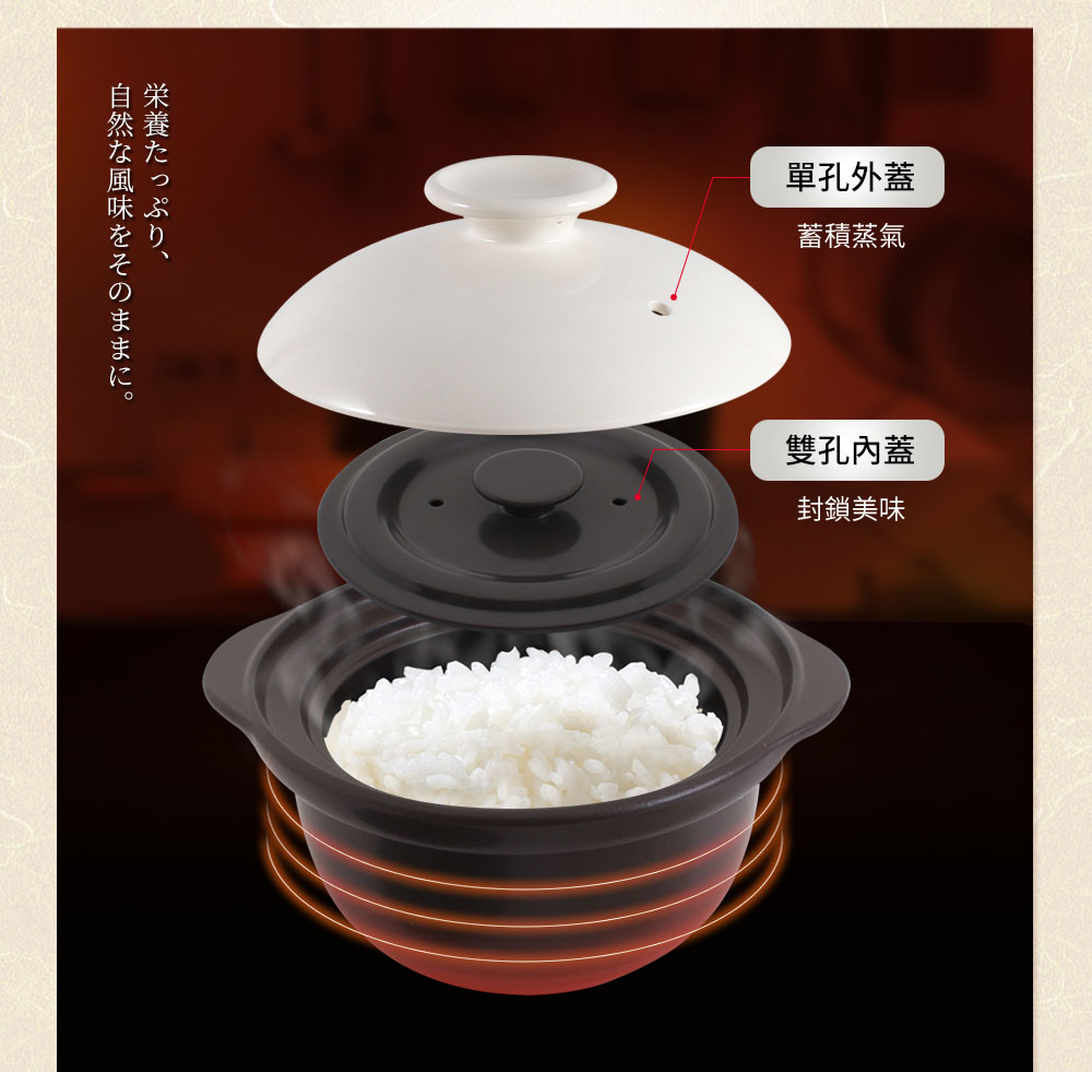 ◆雙蓋厚釜鎖住蒸氣,米飯更Q彈◆玻璃釉面導熱快且均勻◆紅外線功能有效保留食物營養◆吸水率0.5%以下,氣味不殘留◆耐溫差500℃以上,品質優良◆與日本同步發售