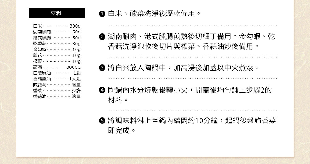 ◆獨特內外雙鍋蓋內外雙蓋搭配並用,氣孔錯開90度,可延長蒸氣留存時間,在蓄存熱量的同時,慢慢將鍋內的米飯炊熟,米粒濕潤Q彈粒粒分明,入口散發香甜美味。◆玻璃釉面導熱快且均勻,退熱慢,聚熱效果佳,節約能源。◆紅外線功能MIYAWO陶土鍋遠紅外線放射率大於90%,高於一般市售陶土鍋20%之放射率,技術獨步同業。紅外線能分解食物中的酶β──澱粉酶,加熱時產生氣泡,有效分解食物中碳化合物、蛋白質、脂肪、礦物質,保持食物原味營養。◆氣味不殘留吸水率0.5%以下,食材氣味不殘留,容易清洗;一般市售陶土鍋吸水率3-5%,毛細孔會吸附食材味道,長時間不使用,容易滋生細菌與發霉。◆耐溫差500℃以上冷熱溫差可達500℃以上,可從冰箱取出直接加熱,品質安全無虞;一般市售陶土鍋耐溫差僅約200℃較易爆裂。◆適用爐具瓦斯爐、烤箱、電鍋、微波爐,亦可使用烘碗機進行烘乾。◆與日本同步發售