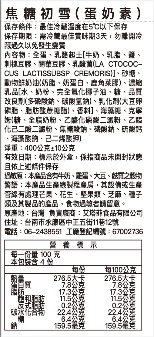 負責廠商:艾塔菲食品有限公司廠商統編:64872889客服電話:06-2430890