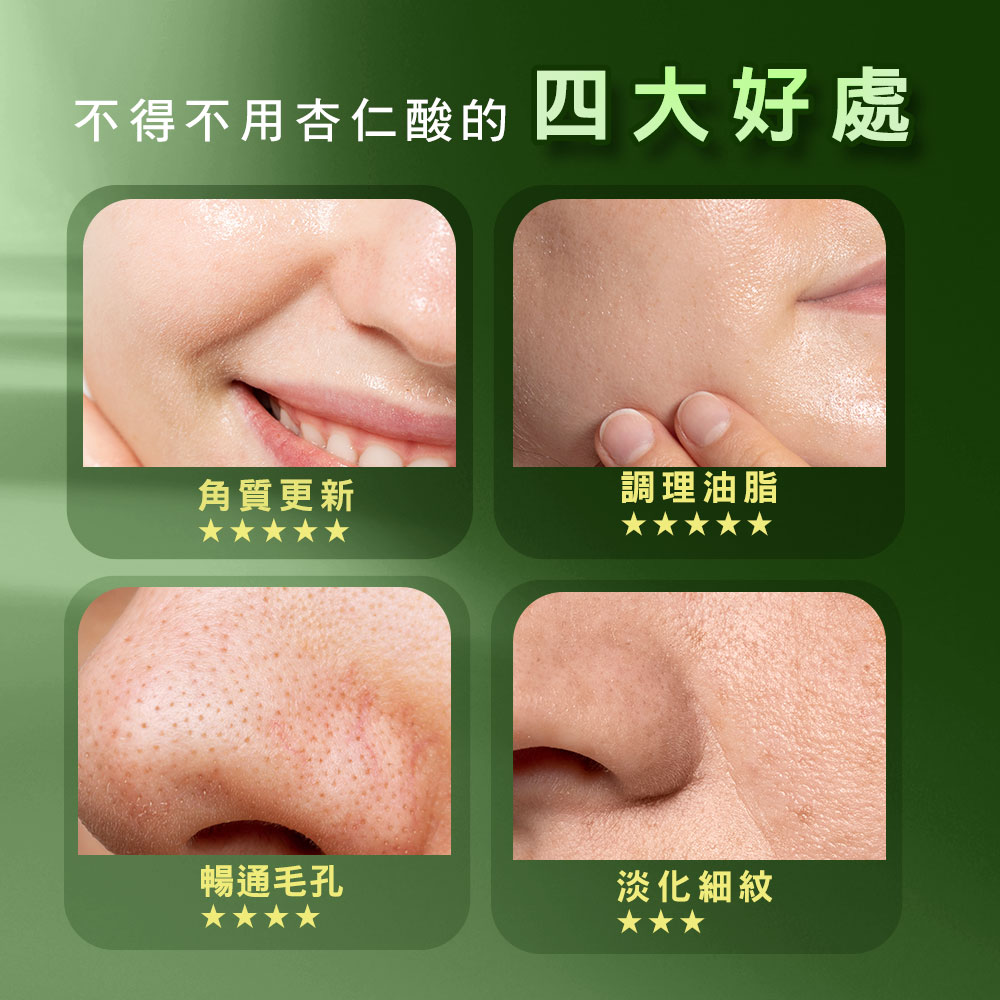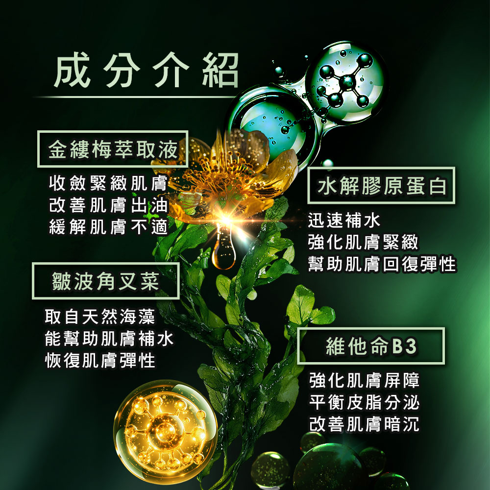 產品成分:杏仁酸、玻尿酸鈉、皺波角叉菜、維他命B3、膠原蛋白、金縷梅萃取。