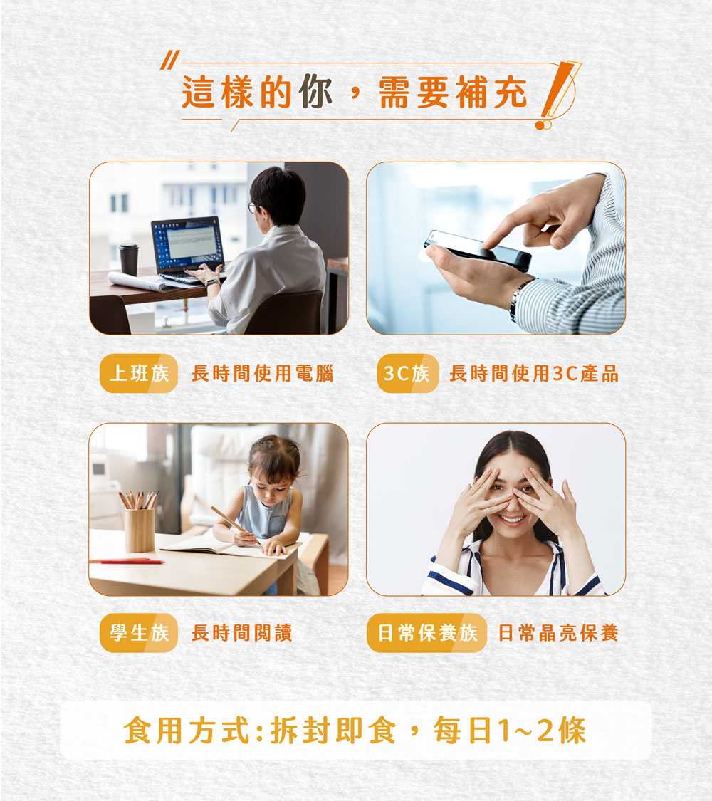 🧐你知道嗎…?台灣人平均每日使用3C產品的時數為10.7小時扣除睡覺時間,等於一天有2/3都在用眼眼睛暴露在好多危險因子下,是時候該保養了✔平均每天不到20元,無負擔輕保養