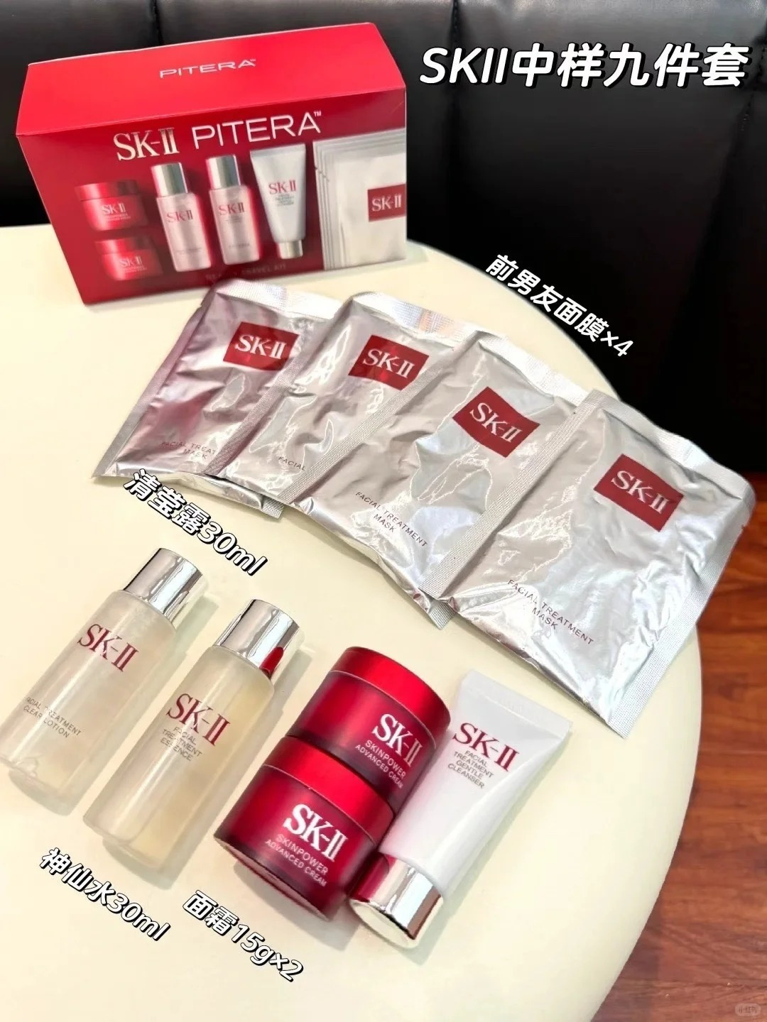 📦商品內容📦1. SK-II 美膚旅行九件套組(青春露 30ml、青春敷面膜 4片、亮采化妝水 30ml、全效活膚潔面乳 20g、致臻肌活能量活膚霜 15g*2)2. 祝福卡片