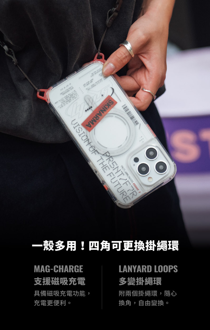 2.5公尺防摔測試 四角加厚防護支援磁吸/無線充電功能IML工藝精緻印刷背蓋防刮耐用鏡頭加高設計保護相機鏡頭不刮傷個性按鈕設計 順暢持久耐用 四角可更換掛繩孔(內附2個掛繩環)商品內容