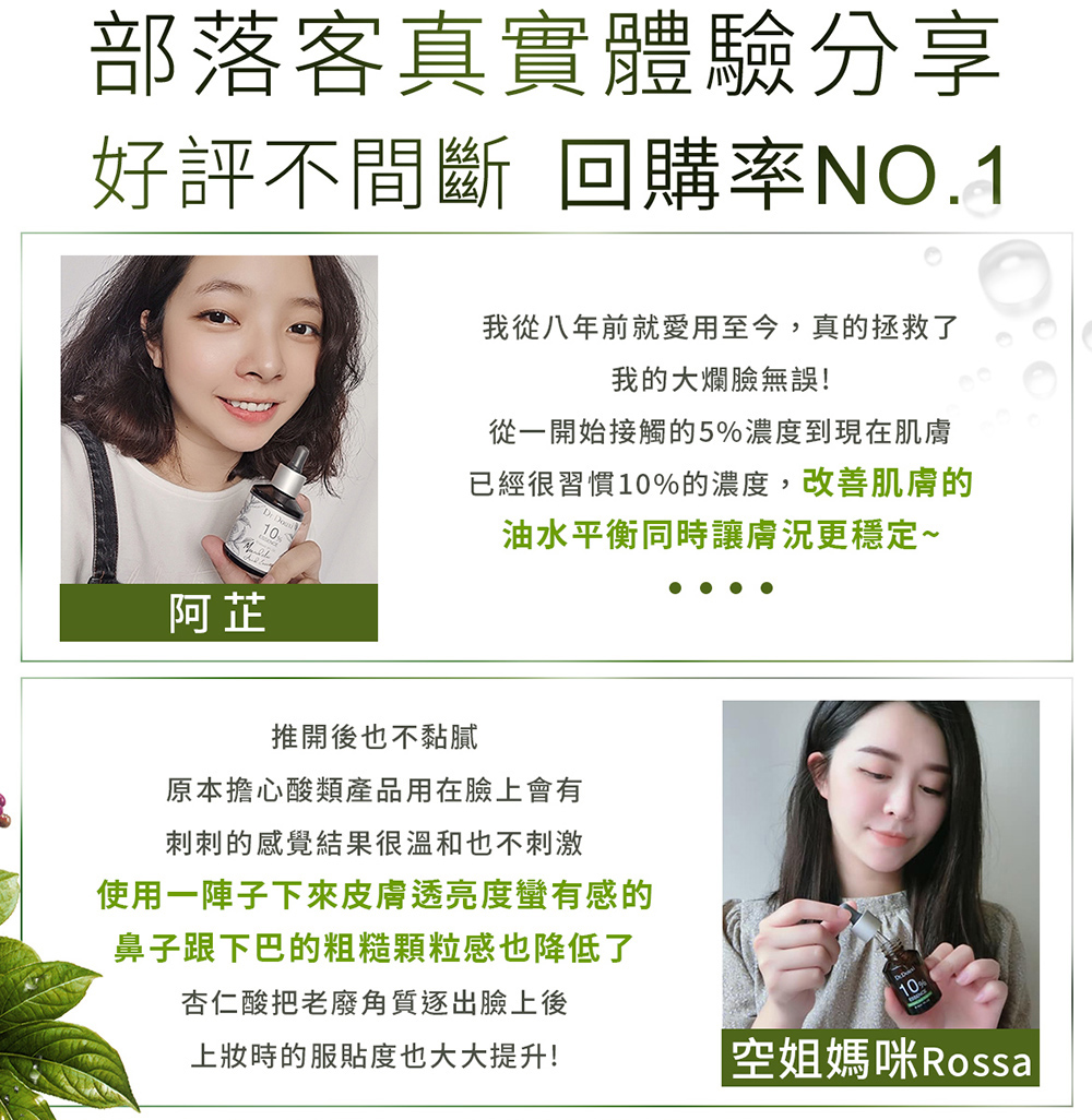 杏仁酸調理膚質,掃除老廢角質,毛孔收斂,提升肌膚亮度。添加玻尿酸、尿囊素、海洋小白菊,提升保濕效果,舒緩酸類成分造成的乾燥不適。