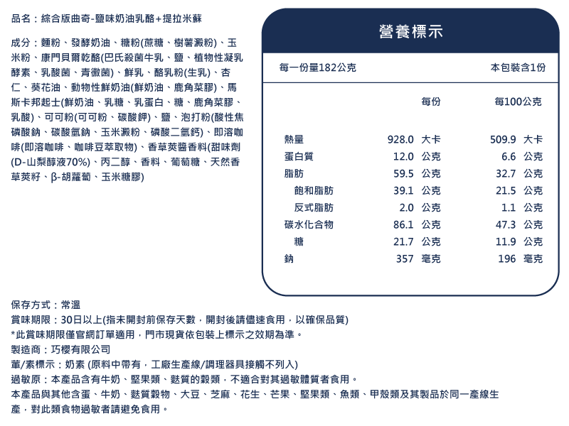 葷/素:蛋奶素(可可曲奇成分含酒)