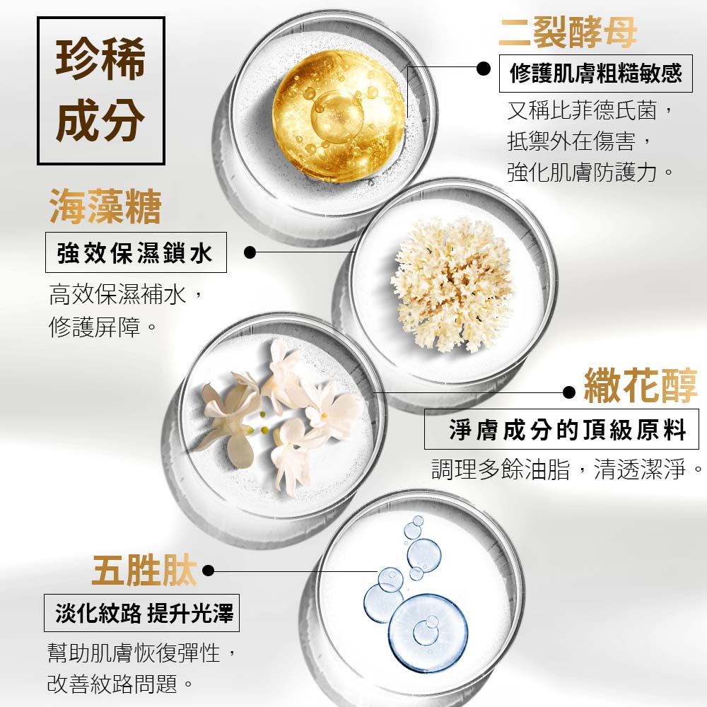全酵潔顏露:二裂酵母、珊瑚肽萃取、胺基酸、魚子精華萃取、天然保濕因子。杏仁酸化妝水:杏仁酸、玻尿酸鈉、皺波角叉菜、維他命B3、膠原蛋白、金縷梅萃取。玻尿酸精華:大小分子玻尿酸、棕櫚酰四肽-7、醣基海藻糖、南極海醣蛋白、水解酵母萃取。熬夜霜:乳木果油、九胜肽、牛尾草萃取、豨薟草萃取、泡葉藻萃取、刺海門冬萃取、玻尿酸。