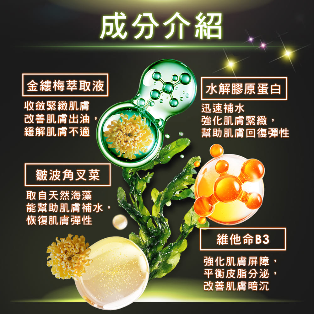 添加棕櫚酰四肽-7,長鏈結構改善肌膚滲透力,讓保濕成分進入肌膚更深處。最後再以南極海醣蛋白做為最後防護,讓防護保濕力up up。