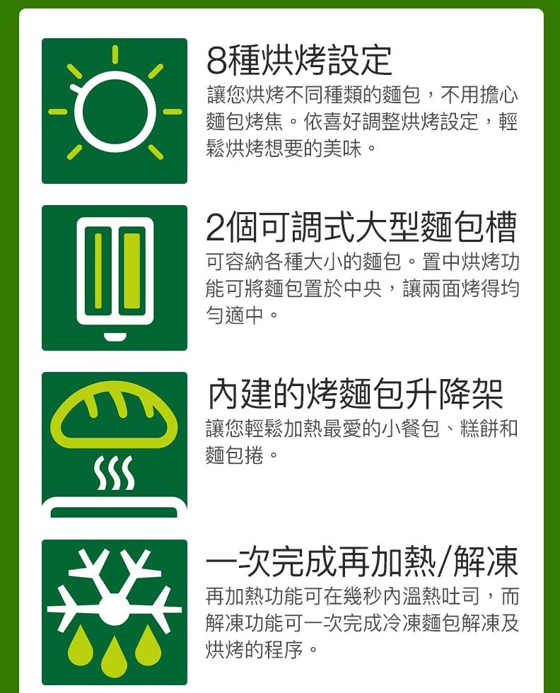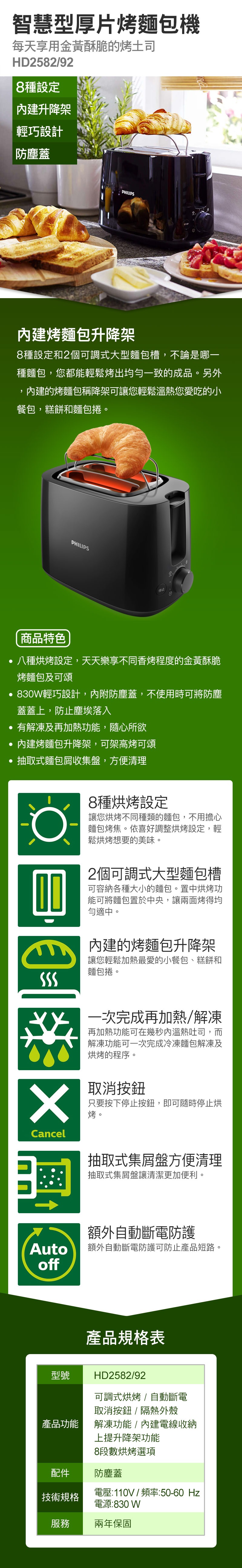 商品特色均勻的烘烤成品• 8 種烘烤設定,滿足個人喜好• 2 個可調式大型麵包槽,可容納各種大小的麵包• 內建的烤麵包升降架,適合加熱麵包捲、糕餅或小餐包簡單易用• 一次完成再加熱、解凍• 取消按鈕可在任何時刻停止烤麵包• 抽取式集屑盤方便清理• 上提升降架可安全取出小片吐司• 額外自動斷電防護【8 種烘烤設定】8 種設定讓您烘烤不同種類的麵包,不用擔心麵包烤焦。依喜好調整烘烤設定,輕鬆烘烤想要的美味。【2 個可調式大型麵包槽】2 個可調式大型麵包槽,可容納各種大小的麵包。置中烘烤功能可將麵包置於中央,讓兩面烤得均勻適中。【內建的烤麵包升降架】內建的烤麵包升降架讓您輕鬆加熱最愛的小餐包、糕餅和麵包捲。【一次完成再加熱、解凍】再加熱功能可在幾秒內溫熱吐司,而解凍功能可一次完成冷凍麵包解凍及烘烤的程序。【隨時停止】只要按下停止按鈕,即可隨時停止烘烤。【抽取式集屑盤】抽取式集屑盤讓清潔更加便利。【上提升降架功能】上提升降架功能方便輕鬆取出小片麵包。【額外自動斷電防護】額外自動斷電防護可防止產品短路。商品規格品牌 PHILIPS飛利浦型號 HD2582/96產地 中國機體材質 PP 塑膠商品尺寸(材積) 184 x 304 x 214 mm電壓 110V頻率 60Hz產品重量 1.141kg保固 2年配件 使用說明保證書