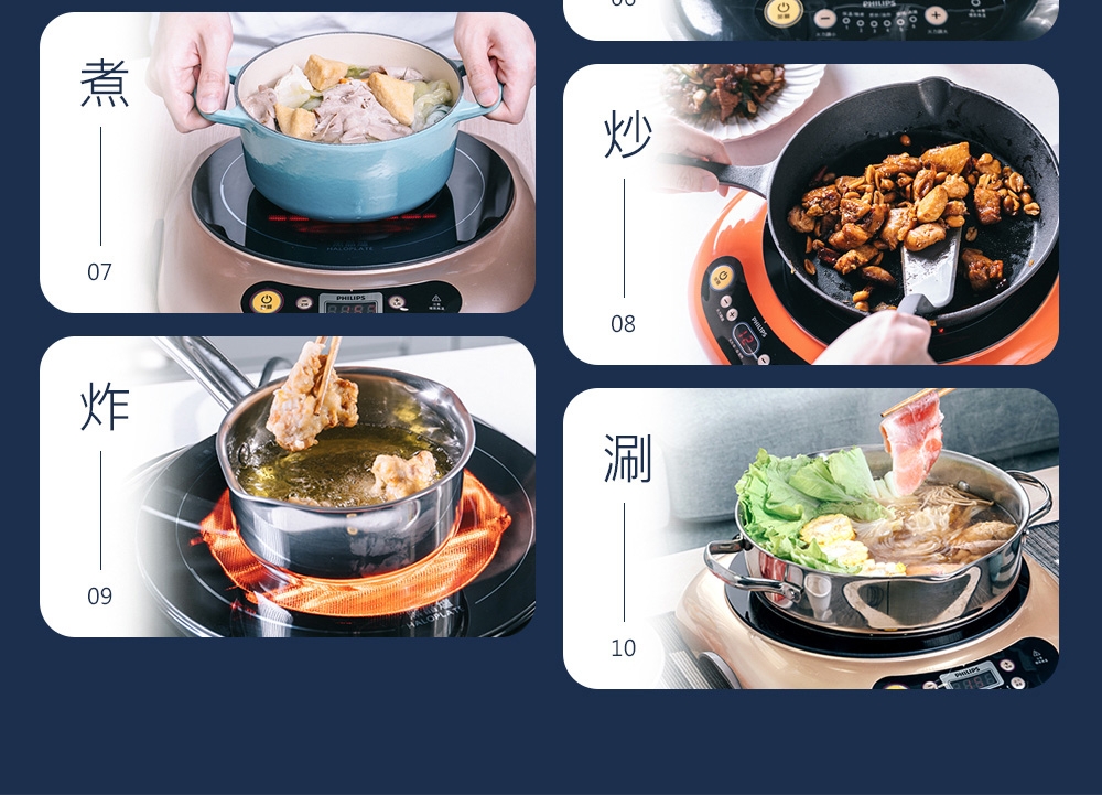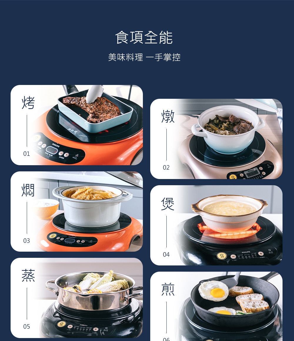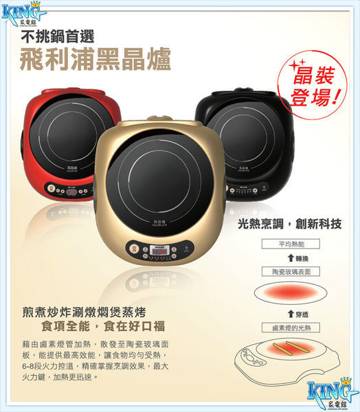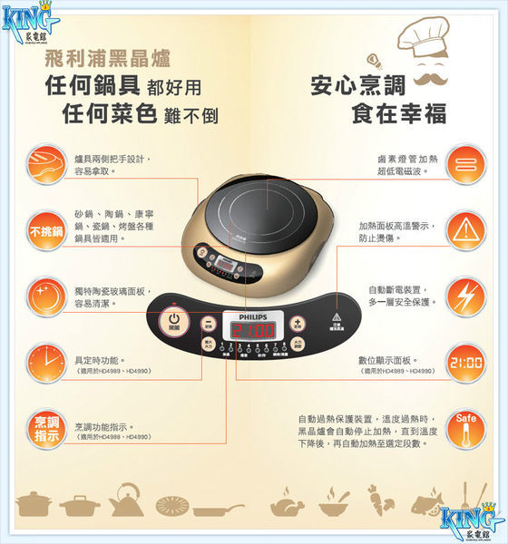 Philips 飛利浦萬用黑晶爐 (HD-4990)時省事好幫手,廚房聰明家現代人有多少時間可以下廚?一想到要做一頓飯得花上半天時間守在瓦斯爐旁,周旋於鍋碗瓢盆當中,煮完一頓飯早已胃口盡失,精疲力盡了呀!飛利浦黑晶爐給你一個烹調新概念,無論是煎、煮、炒、炸、燉、都可輕鬆辦到喔。黑晶爐豪華款能迅速,具備 LCD 顯示幕、最大火力快速鍵、八段火力設定、烹調功能指示、定時功能。陶瓷玻璃面板加熱均勻,讓您迅速輕鬆準備餐點。內建安全自動斷電功能,可避免過熱。高科技方便有效率,不須另添購新鍋具來配合產品,現有鍋具即可使用 移動式爐具清洗容易,且不易造成刮痕 無需等待即開即熱,瞬間加熱至 700 ℃ 貼心設計,防燙傷 效率佳,節省能源 多一層安全考慮