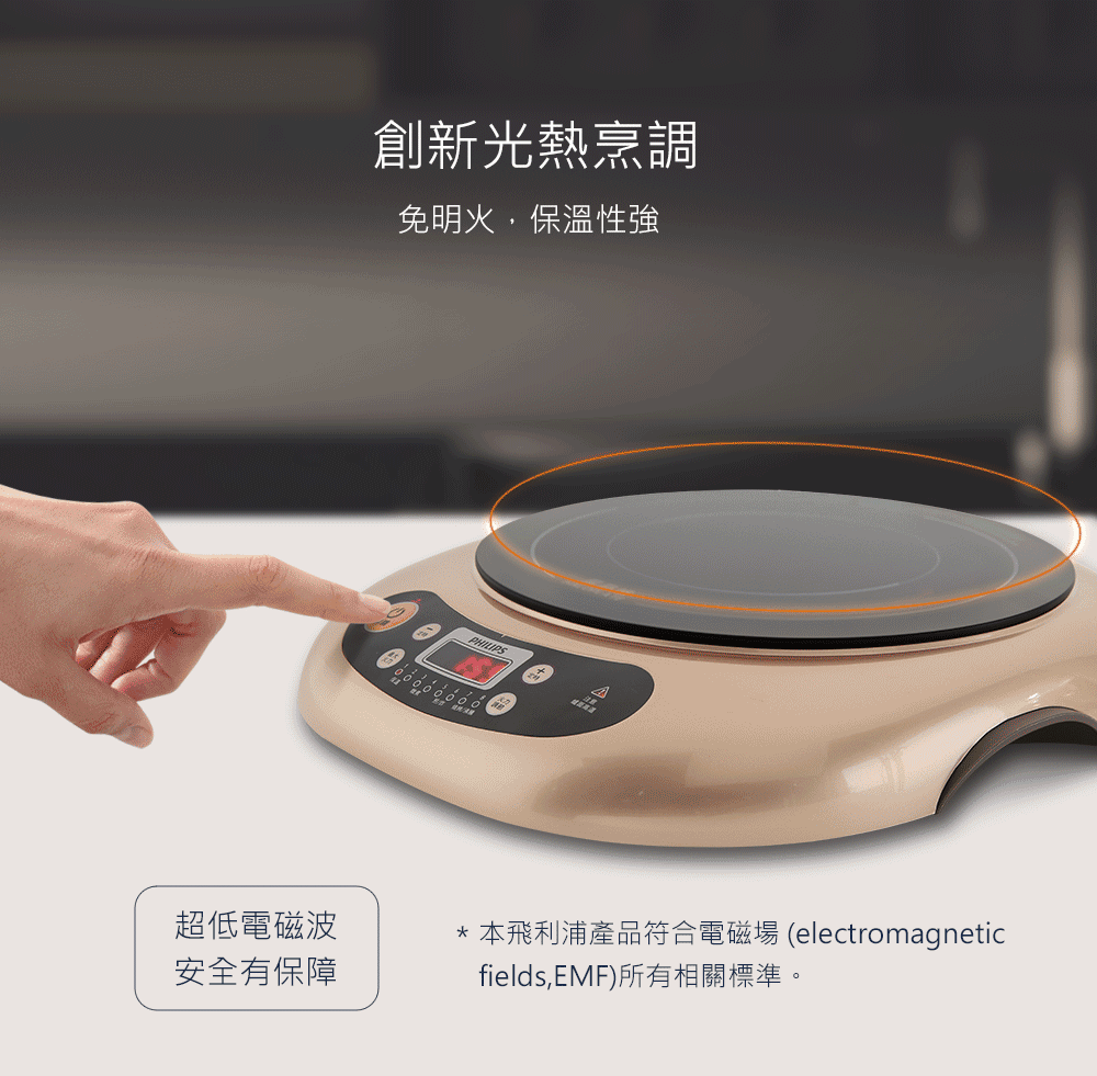 商品特色:以光導熱,不挑鍋 八段火力控制,掌握精確烹調效果烹調功能: 保温/燉煮/煎炸/燒烤/沸騰 香檳金時尚外觀鹵素燈管加熱, 超低電磁波獨特陶瓷玻璃面版,清洗容易熱源集中,均勻快速“最大火力”鍵,快速達到最大火力數位顯示面板, 具定時功能面版餘熱警示,貼心設計,防範燙傷自動斷電安全裝置,多一層安全保護兩側具把手,容易拿取產品規格