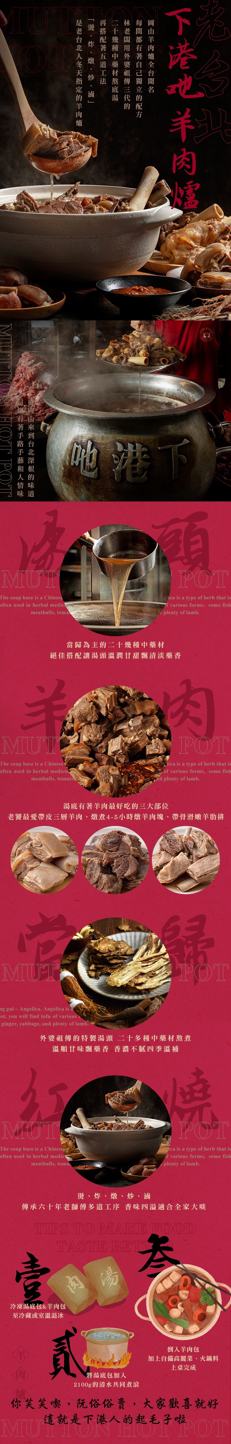 1.商品組合/規格:當歸羊肉爐一組+綜合肉一盤2.商品品名:《下港吔羊肉爐》必吃當歸羊肉爐套餐(3-4人份)3.商品重(容)量:當歸羊肉爐一組:970g(羊肉270g±5%、當歸湯底700g),綜合肉一盤:220g±5%(羊肉)4.內容物成分(如含有豬、牛成分請加註國別):【紅燒羊肉爐】:羊肉、當歸湯底(當歸、川芎、參須、甘草、肉桂、上桂枝、食鹽、高鮮味精)豆瓣醬(黃豆(基因改造)、辣椒、辣椒粉、水、八角粉、糖、鹽、調味劑(L-麩酸鈉、5'-次黃嘌呤核苷磷酸二鈉、5'-鳥嘌呤核苷磷酸二鈉、琥珀酸二鈉、檸檬酸)、甜味劑(甘草素)、粘稠劑(玉米糖膠))【綜合肉】:羊肉5.食品添加物名稱:無6.原產地(國):台灣7.製造廠商或國內負責廠商名稱:樂天派股份有限公司8.製造廠商或國內負責廠商地址:台北市中山區南京西路1-1號6樓621室9.製造廠商或國內負責廠商電話:02-2511-593710.保存期限:冷凍365天11.食品業者登錄字號:A-152464493-00000-512.投保產品責任險字號:150211PD03070號備註欄:將湯包解凍後倒入鍋中,加入約2100c.c.開水與少許米酒煮沸。
