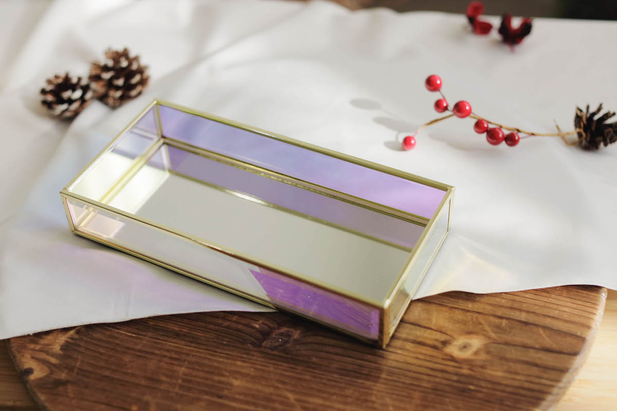 ❤ 可作為展店擺飾品、市集擺攤、陳列道具使用❤ 「獨家設計款」極光飾品收納盒,自用送禮都適合❤ 內底鏡面材質,放入各式物品,即映照出不同美麗畫面❤ 特殊玻璃工法,使玻璃在不同光線下會如極光般散發出不同色彩
