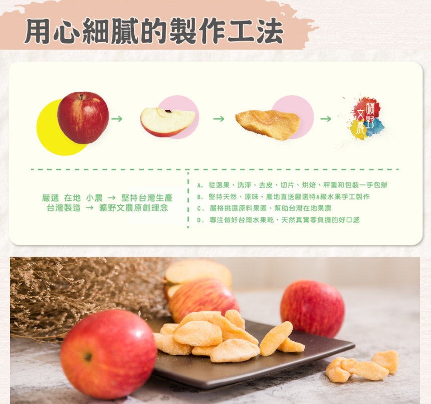 1.🍎🍎🍎台灣小農蘋果乾• 選用外觀較圓、形狀均勻、顏色金黃、表皮粗糙的蘋果,做成果乾口感最好。• 外脆內軟、吃起來像軟糖一樣,小朋友最愛。• 成分 : 新鮮蘋果、糖• 產地:台灣• 重量:170g±5g