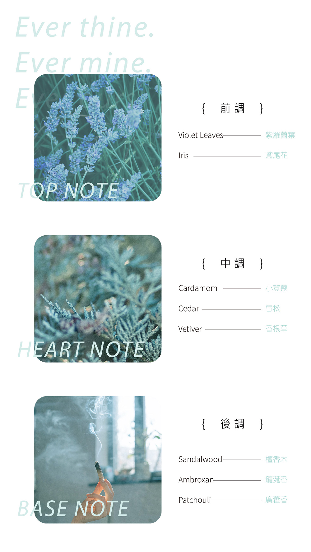 ・前調:紫羅蘭葉、鳶尾花、佛手柑・中調:小荳蔻、雪松、香根草・基調:檀香木、龍涎香、廣藿香