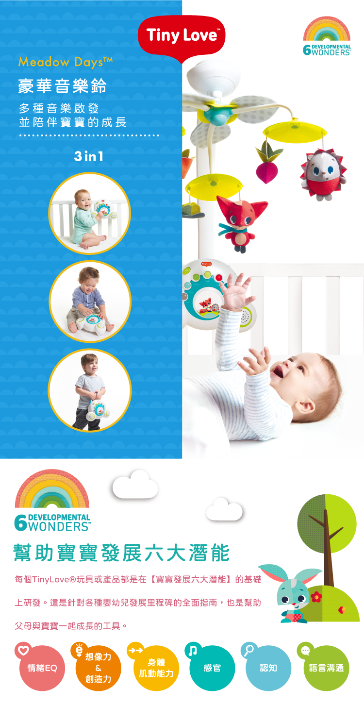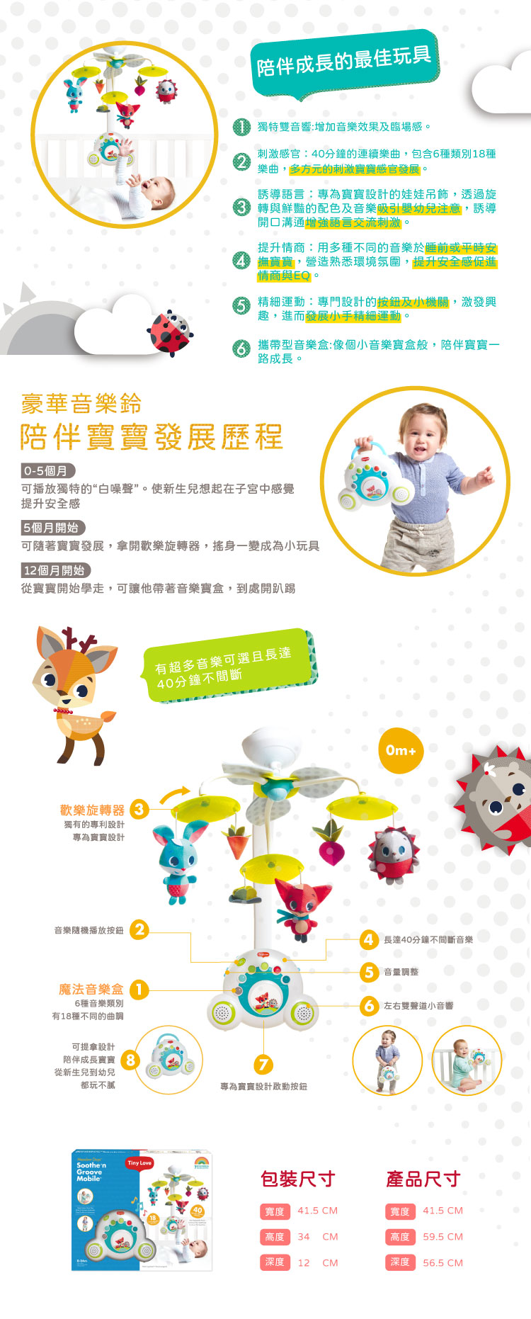 刺激感官:40分鐘的連續的樂曲,包含6種類別18種不同的樂曲可以選擇,多方元的刺激寶寶的感官發展