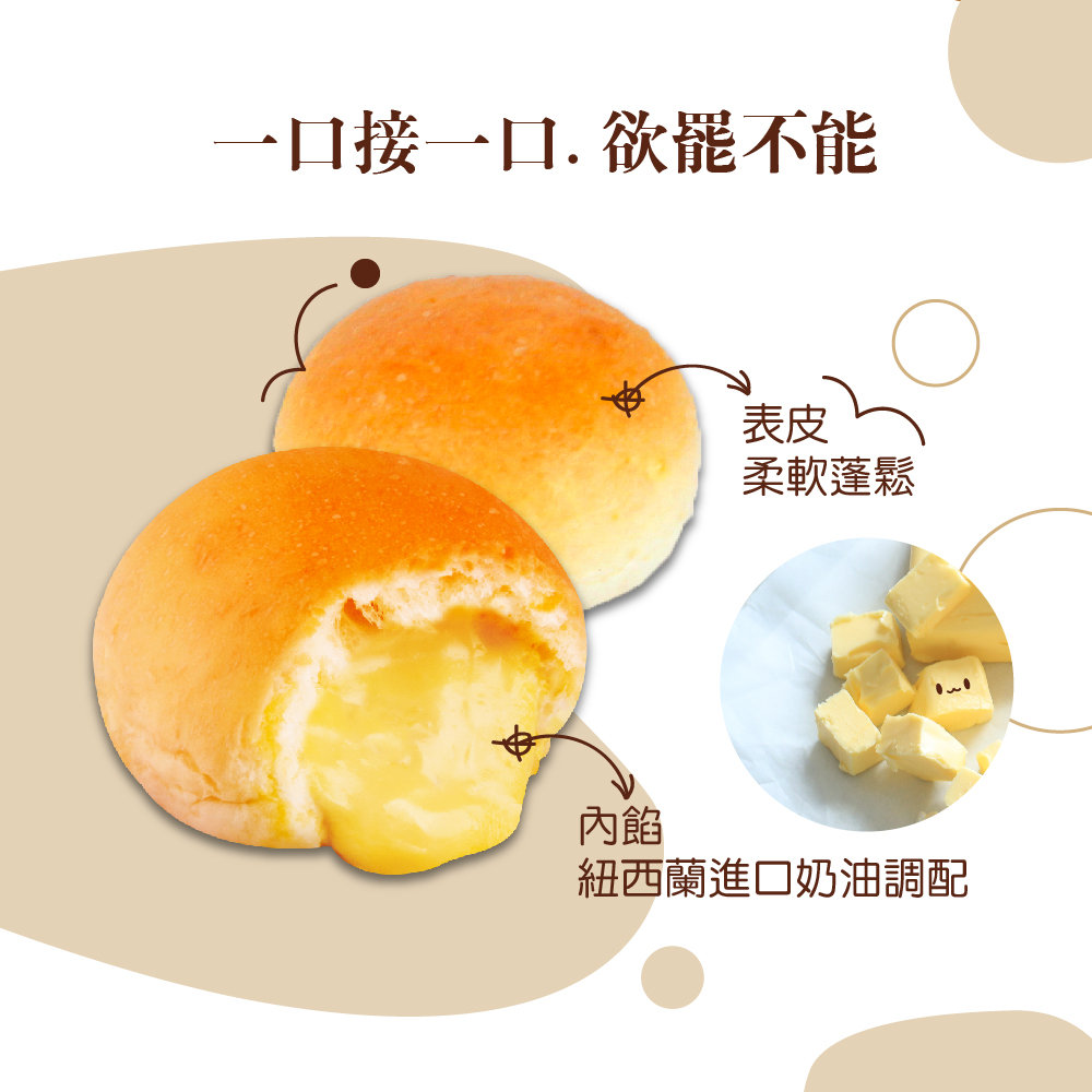 商品介紹{爆漿奶油餐包}✔ 表皮柔軟蓬鬆✔ 內餡紐西蘭進口奶油調配✔ 一口接一口,欲罷不能