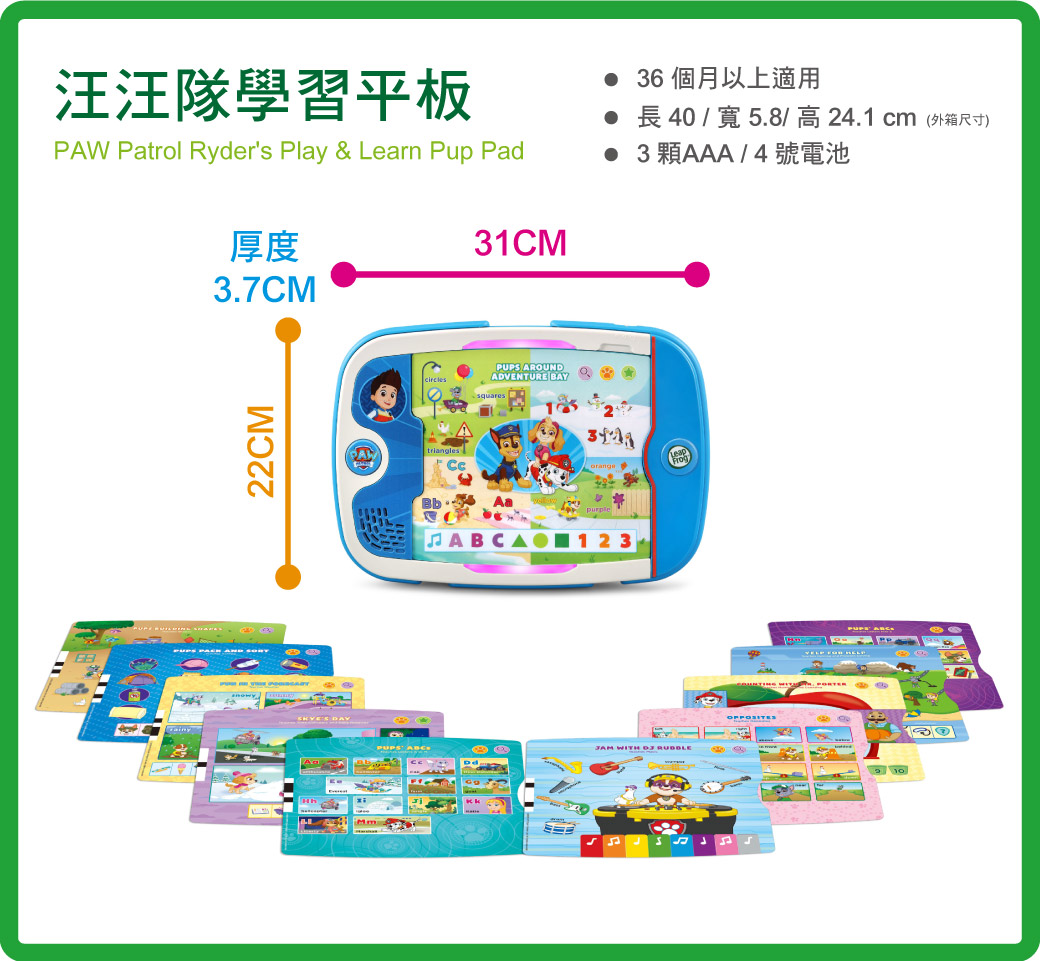 *10 張雙面圖卡插入平板,探索 20 多種學前技能,包括字母、數字、顏色、形狀、解決問題和社交技能*將圖卡放入平版後,利用手指點擊或輕滑圖卡觸控操作,與語音進行不同互動*500多種學習問題,與狗狗並肩合作學習新知識、進行救援和解決問題*認識圖卡內容,選擇右上小腳腳模式後點擊圖卡,平板會發出字母、單字、短句等等發音,訓練聽力及發音*挑戰開始!選擇右上放大鏡,依照平板的指示,跟著汪汪隊完成任務。任務可能是,找出被受困的狗狗。學習短句聽力及發音。*圖卡輕鬆更換,且玩完後可存儲於內置的卡夾,方便隨身攜帶外出*無屏幕平板玩具,讓學齡前兒童可以輕鬆體驗*多元學習主題-顏色/數字及數數/字母發音/形狀/音樂/解決問題/邏輯與推理/社交技能