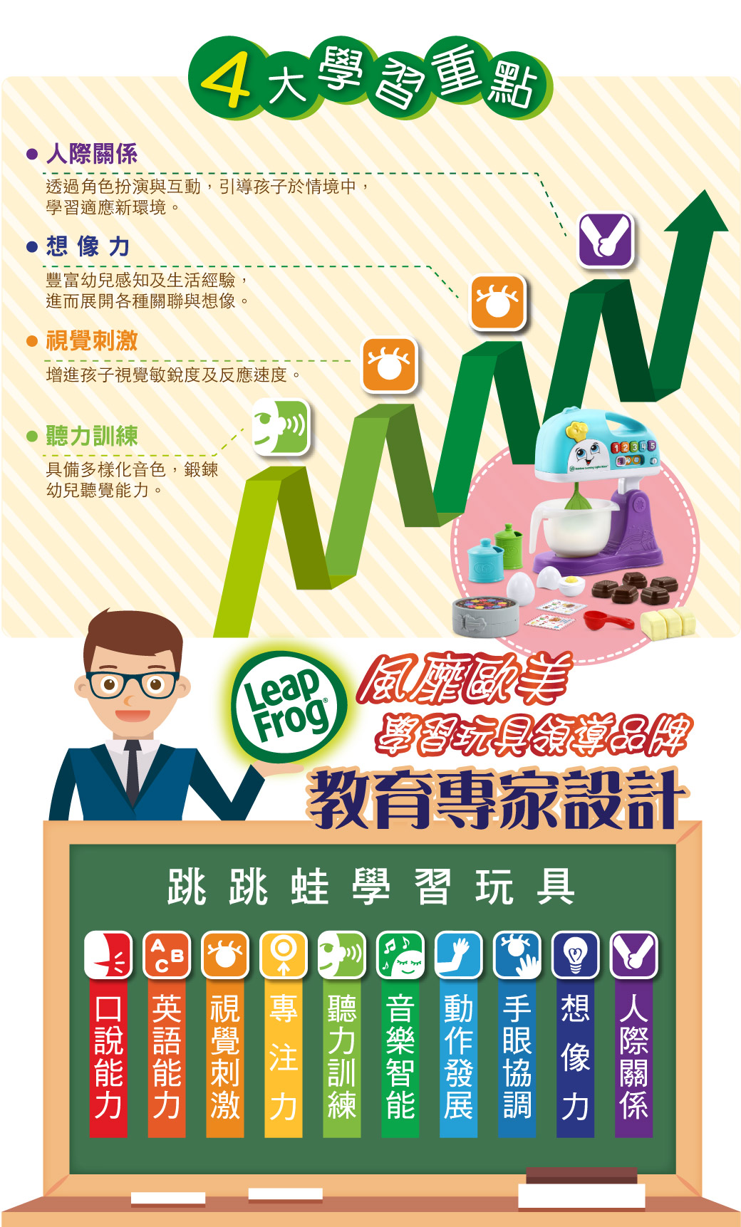 *使用攪拌機攪拌食物,能真實體驗甜點製作過程,讓孩子扮演小小甜點師,激發想像力與創造力*依照指令,收集不同數量巧克力塊、不同大小奶油塊,也可敲開雞蛋,認識食材的型態與訓練數數*數字模式-將材料放入攪拌碗,選擇數字按鈕使槳旋轉並發出彩色燈光,並聆聽數字的發音*彩色盤模式-將材料放入後點選數字,攪拌機會發出顏色的發音,同時還有音樂的伴奏*特製食譜-依照食譜卡的指示,拿取正確的食材來製作多種餅乾、紙杯蛋糕等,可練習眼部及手部小肌肉*將製作好的食材一層一層放在蛋糕上。可練習堆疊,增加手眼協調能力並訓練手部小肌肉*按下廚師帽,按照廚師指示拿取正確食材,完成後有美妙的歌曲慶祝成功*多種學習主題:數字/顏色/數數/手部運動技能