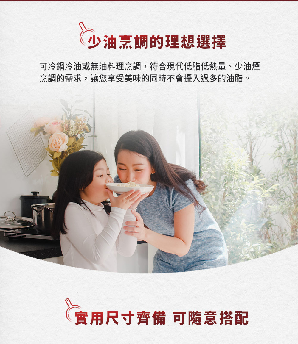 **貼心提醒**—適用於一般家用爐具:瓦斯爐、黑晶爐、紅外線爐、電爐、鹵素爐、電磁爐。—請使用木鏟、筷子、矽膠或塑膠製耐熱鍋鏟,常保塗層最佳效果。