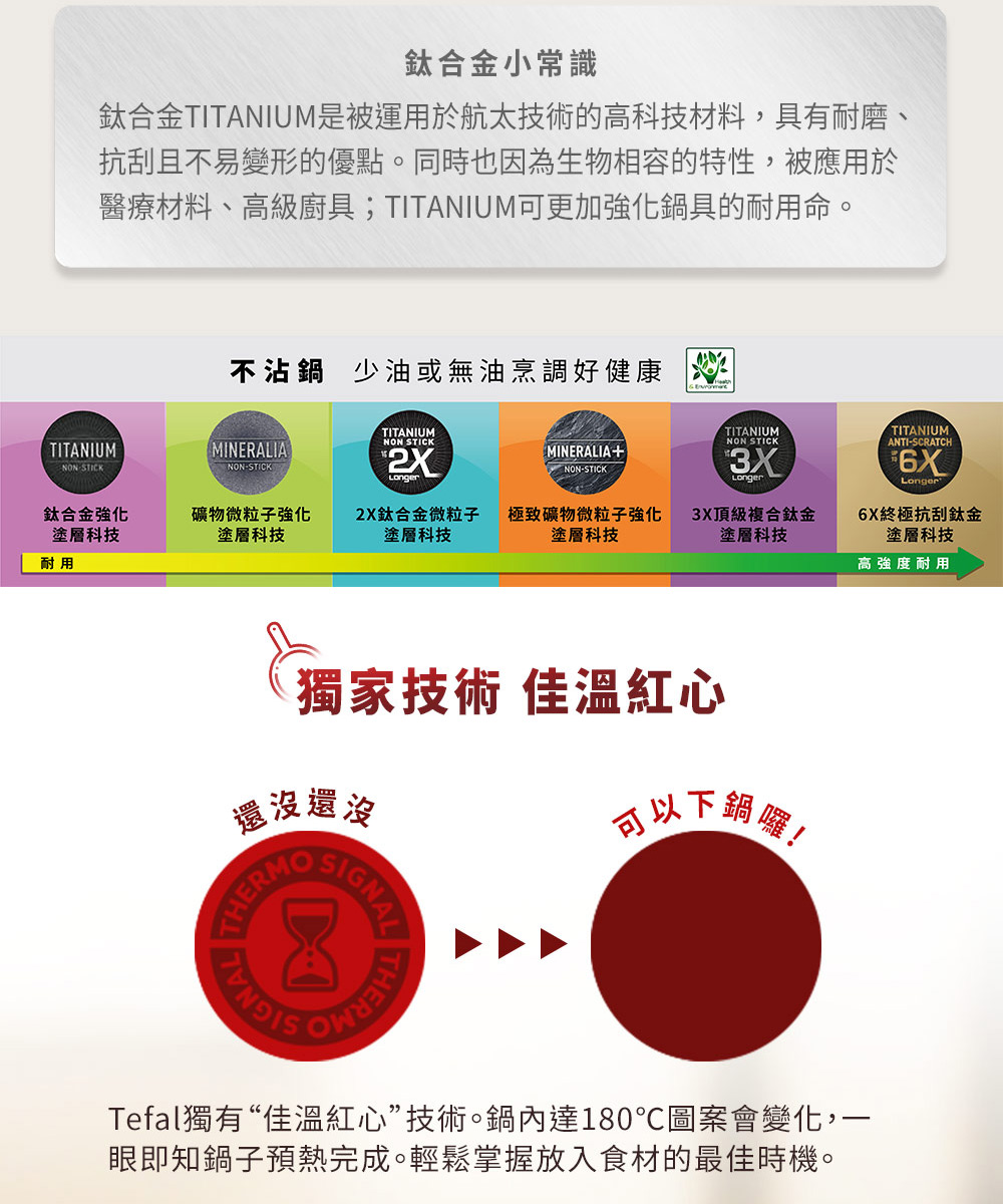 ◆可冷鍋冷油或無油料理烹調,享受美味的同時不會攝入過多的油脂。◆鍋底面積大,適合各種煎煮料理,從家常菜到點心,都可輕鬆掌握!◆亮眼的紅色鍋身優雅美觀,料理後可直接上桌,提升生活質感。◆PTFE不沾處理的防沾抗污鍋身,可放入洗碗機,適合忙碌現代家庭使用。◆從鍋內到鍋外,不沾處理無縫接合,乾淨無死角更衛生。◆搭配紅色鍋身的同色把手美觀大方,符合人體工學,省力舒適。◆把手與鍋身直接焊接,鍋內無鉚釘不會藏污納垢,烹飪衛生好放心。◆可吊掛或堆疊,收納更彈性方便。◆TITANIUM 3X 頂級複合鈦金不沾塗層,鈦合金微粒子強化,抗磨耐刮表現出眾,可防止食材沾黏在鍋面,完美保持食材的質地和風味。◆獨家佳溫紅心技術,180°C時紅心會改變顏色,熱鍋完成一看即知。◆Thermo-Fusion™底部結合INDUCTION電磁感應技術,厚實磁化不鏽鋼,鍋底不易變形更耐用。◆導熱快又均勻,IH電磁爐同樣快速加熱,節省烹煮時間和能源。◆法國生產製造原裝進口,不含PFOA、重金屬,安全無毒,經法國國家認可機構檢定,符合法國及歐洲鍋具安全規定。