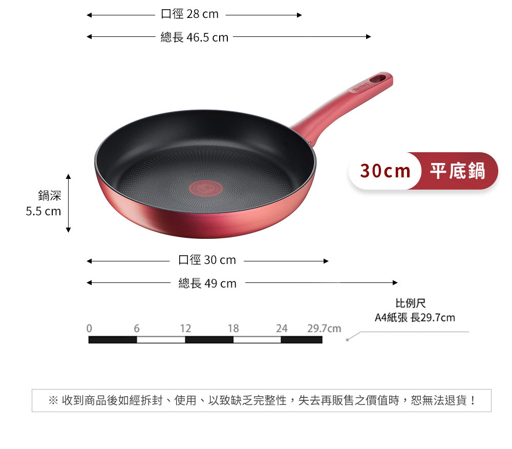 *不沾鍋之使用說明*1.使用前請除去所有包裝及標籤。某些煎鍋在運送的時候鍋把底部會有保護膠,使用前請除去丟棄。 2.第一次使用時請先裝八分滿的水煮沸、倒掉、擦乾,Tefal不沾鍋不像其他材質的鍋具(如:鐵鍋)容易生鏽變質,因此不需要養鍋,請在每次使用完畢後徹底清潔且搭配正確的保養使用習慣,即可長保不沾效果。3.建議使用木鏟、筷子或不沾鍋適用塑膠電木鍋鏟,可避免刮傷塗層而影響日後使用便利性,延長使用壽命。4.特福不沾鍋因鍋底設計具有高傳熱功能,建議用中小火烹調即可,節省能源又可避免營養流失,更能減少油煙的產生。5.避免空燒可延長鍋具使用壽命以及居家安全。6.請使用溫水及中性清潔劑清洗鍋具。7.每次使用鍋具後,請用海綿、軟布或先用餐巾紙擦拭即可,不可使用任何菜瓜布或金屬絲等粗糙材質的刷子,以免影響日後使用的方便性。8.因為特福鍋具鍋底皆有防變形設計。若在鍋熱時清洗,請先以鍋子背面著水以利於快速散熱,可避免鍋具因熱脹冷縮而變形。※收到商品後如經拆封、使用、以致缺乏完整性,失去再販售之價值時,恕無法退貨!