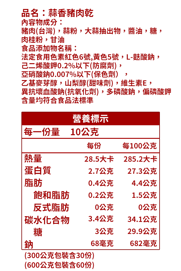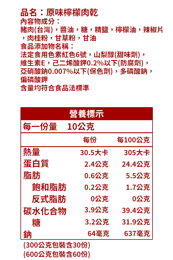 內容物:特厚蜜汁豬肉乾190g+蒜香豬肉乾190g+原味檸檬肉乾190g