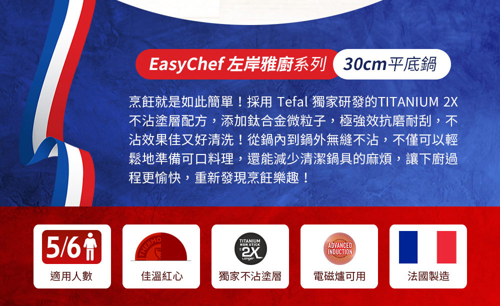 烹飪就是如此簡單!Easy Chef左岸雅廚系列採用Tefal獨家研發的TITANIUM 2X不沾塗層配方,添加鈦合金微粒子,極強效抗磨耐刮,不沾效果佳又好清洗!從鍋內到鍋外無縫不沾,不僅可以輕鬆地準備可口料理,還能減少清潔鍋具的麻煩,讓下廚過程更愉快,重新發現烹飪樂趣!