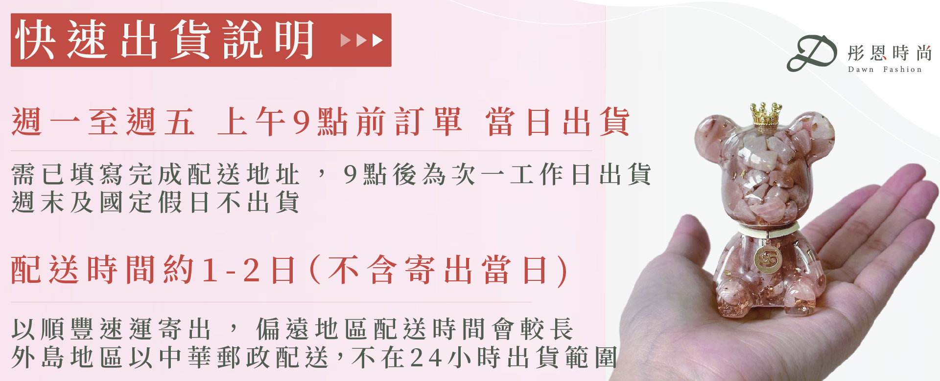 • 完成付款及寄送地址確認後,本公司會盡速以配合的物流寄出,出貨時間為1~2日工作天(不含例假日),實際配送時間以物流公司為準,如遇缺貨延遲出貨時,會以簡訊通知收件人。
