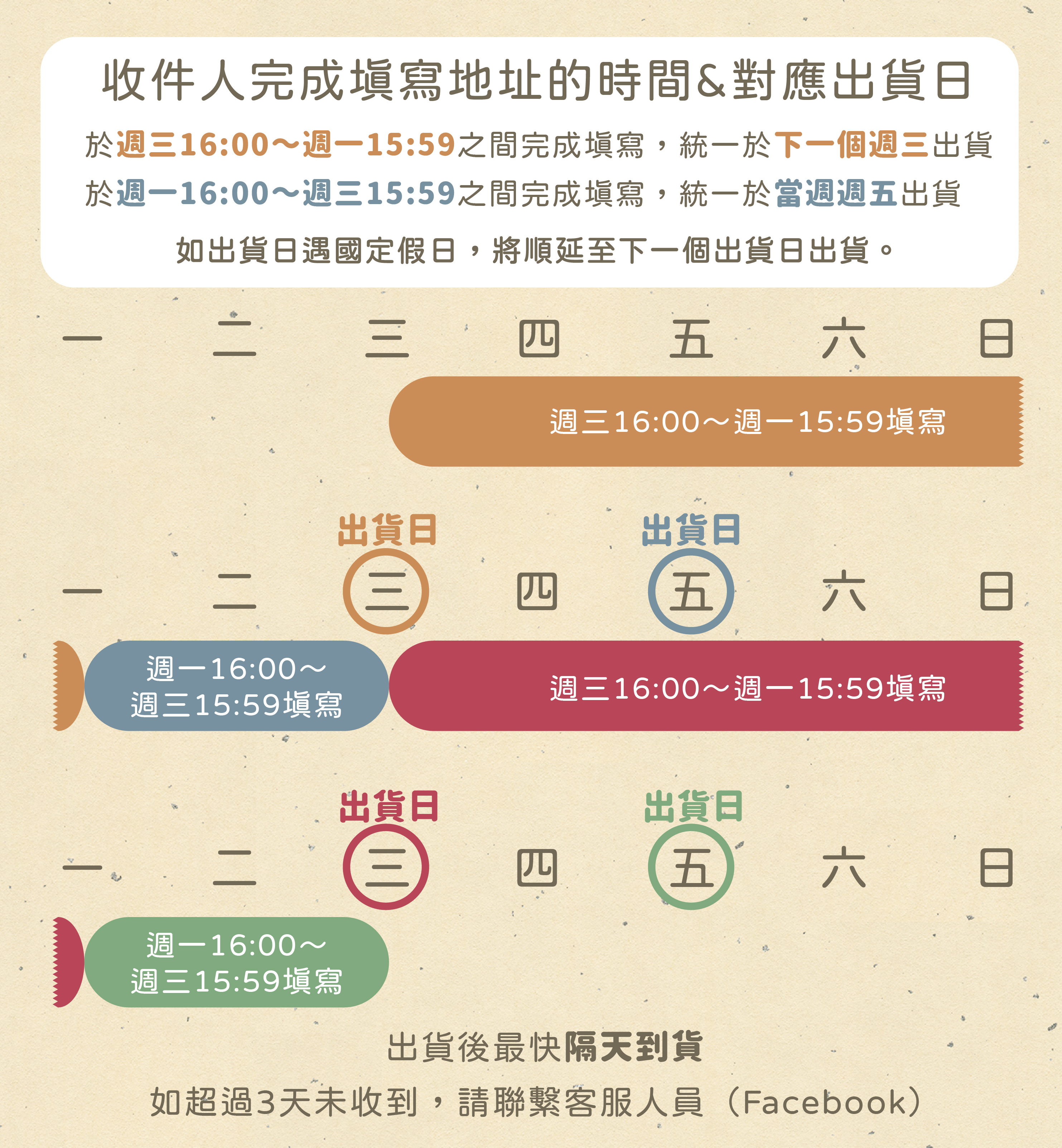 完成付款後會使用黑貓宅急便冷藏配送寄出,出貨時間為填寫收件地址後的7天內出貨(每週三、五出貨一次,如出貨日遇國定假日,將順延至下一個出貨日出貨。),出貨後約1~2天內會到貨。