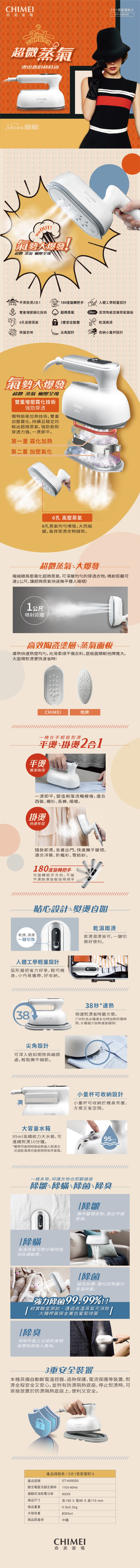 產品型號:ST-H095S0 (時尚白)電壓:AC110V 60HZ功率:930W容量:水箱95ml (內附 防燙底座、水杯)產品尺寸:L198 x W86 x H119 mm產品淨重:0.9 KG彩盒尺寸:L265 x W140 x H145 mm彩盒毛重:1.2 KGBSMI許可字號:R55987產地:中國國際條碼:4713170846212