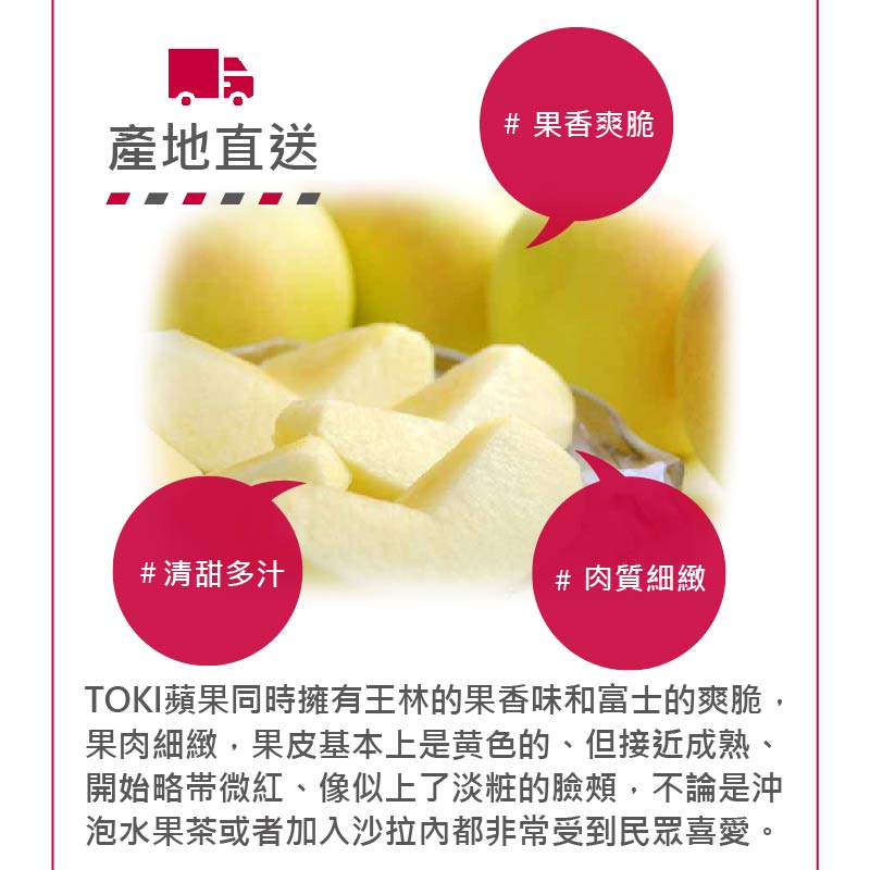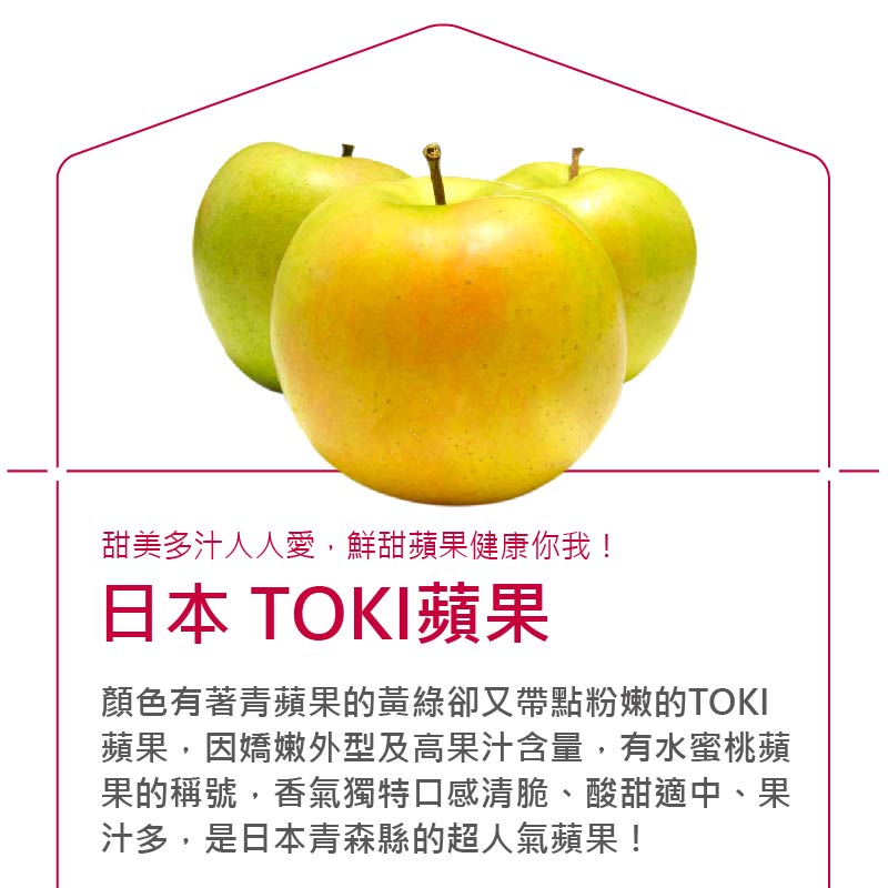 TOKI蘋果(トキ)產自青森,結合王林及富士的優點而成。果皮無蠟散發自然光澤,金黃中帶著粉紅,如水蜜桃一般,故在台灣又被稱為水蜜桃蘋果。果肉細緻爽脆,帶著蘋果馥郁優雅香氣,甜度高且多汁,產期短,是期間限定的美味。