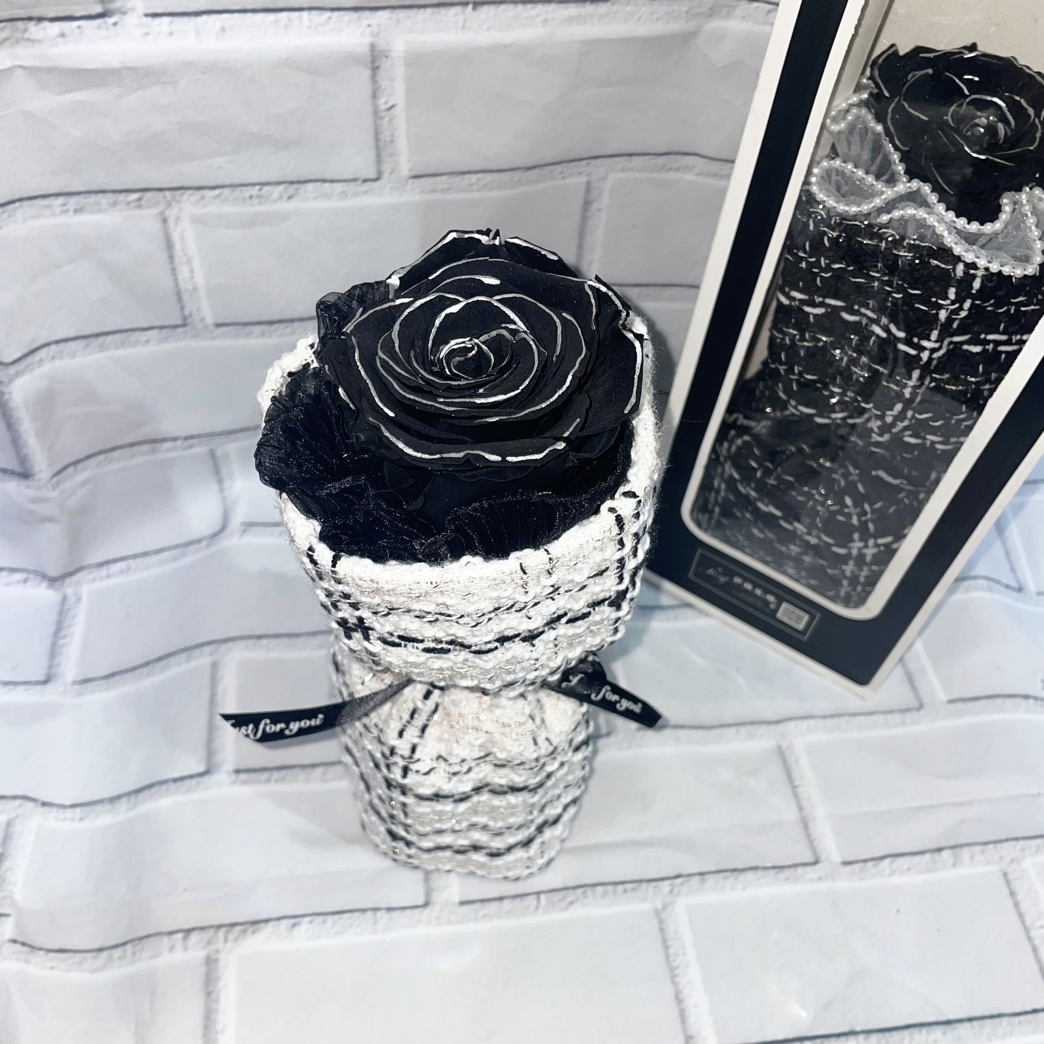 花禮說明:單朵厄瓜多Roseamor永生鑲邊玫瑰花XL號+小香風包裝花禮尺寸:10×26公分