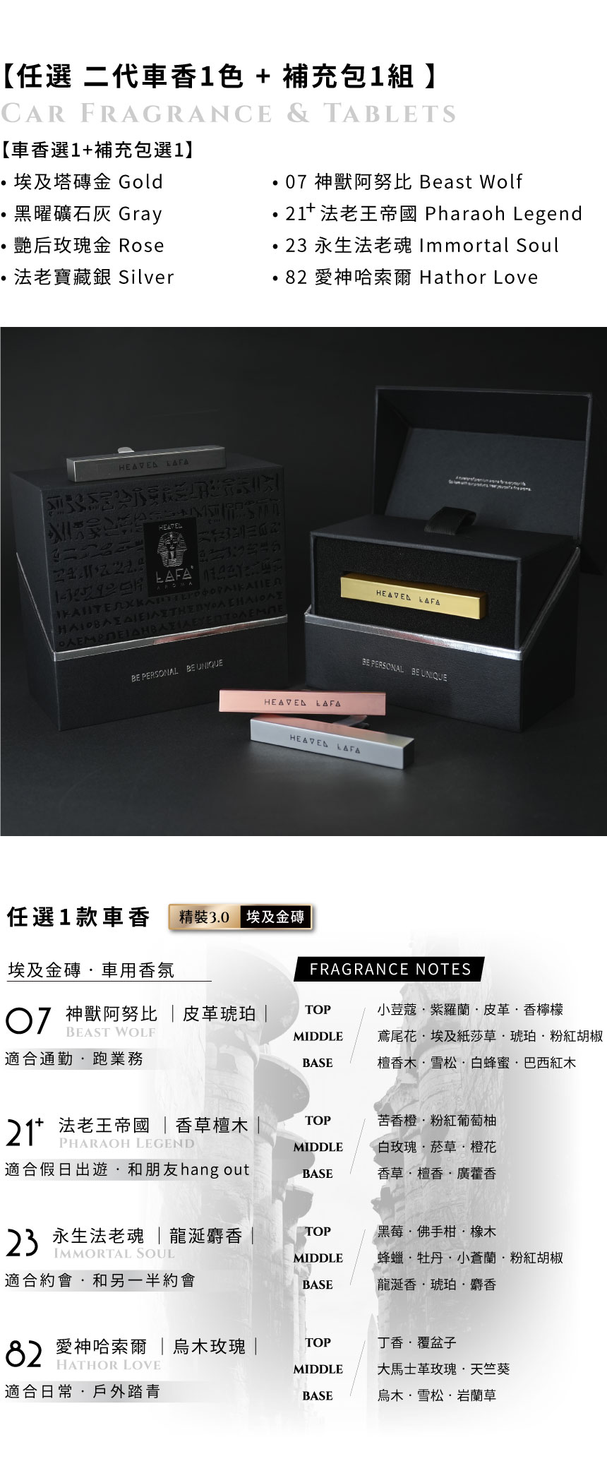 顏色:埃及塔磚金 Gold/黑曜礦石灰 Gray/艷后玫瑰金 Rose/法老寶藏銀 Sliver材質:高精度鋅與錳合金/高品質矽酸鈣, Fragrance尺寸:73 * 11 * 10 mm重量:約30g用途:車用,增添車內怡人香氣、芬芳用。用法:金磚內放入香氛片,安裝至出風口。