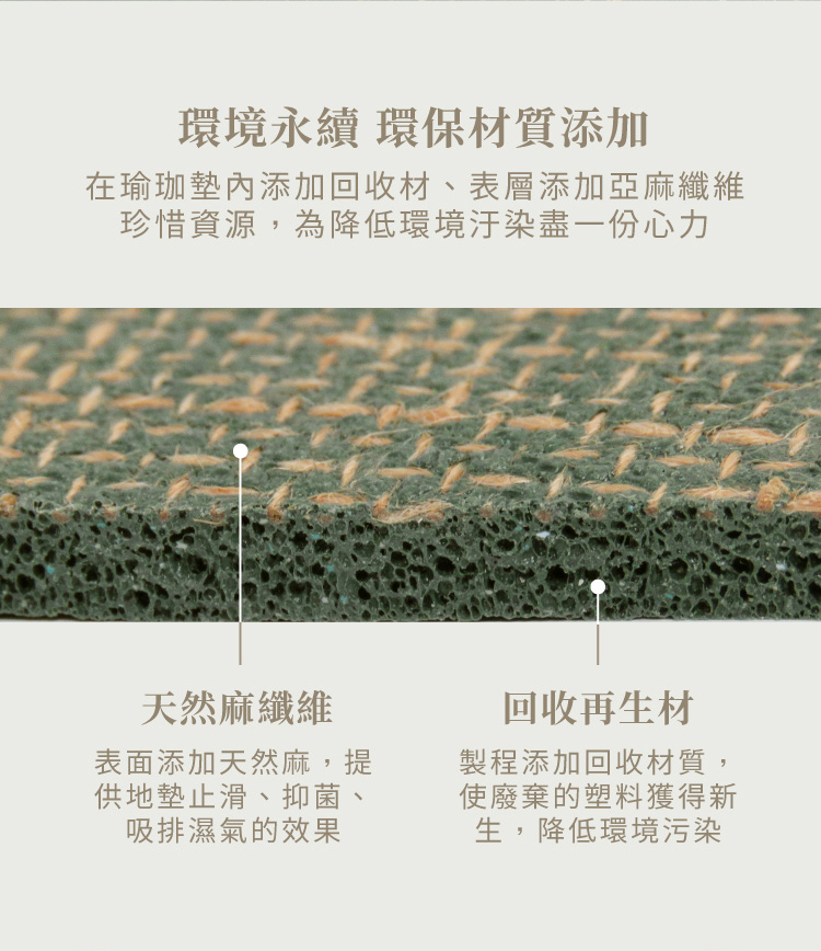 添加天然麻纖維、製程回收再生材,堅持永續精神。