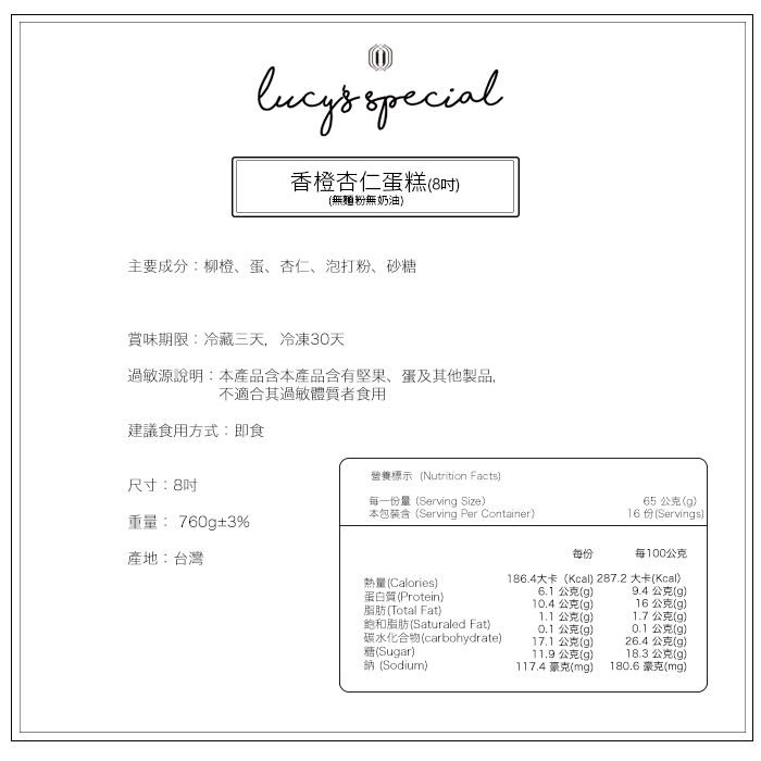 1.商品組合/規格:香橙杏仁蛋糕(無麵粉無奶油) -6吋/8吋