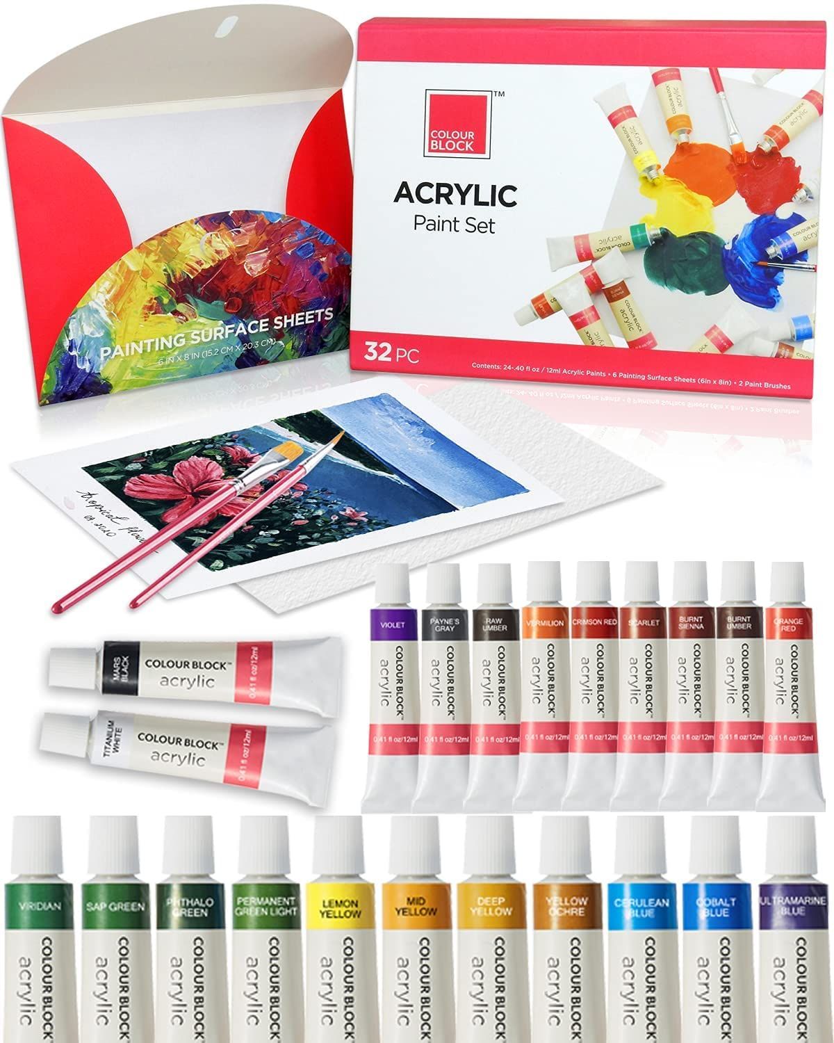 24色x 12ml壓克力顏料,2支金尼龍毛刷,6張6英寸x 8英寸畫紙,耐用且彩色的紙板外盒。