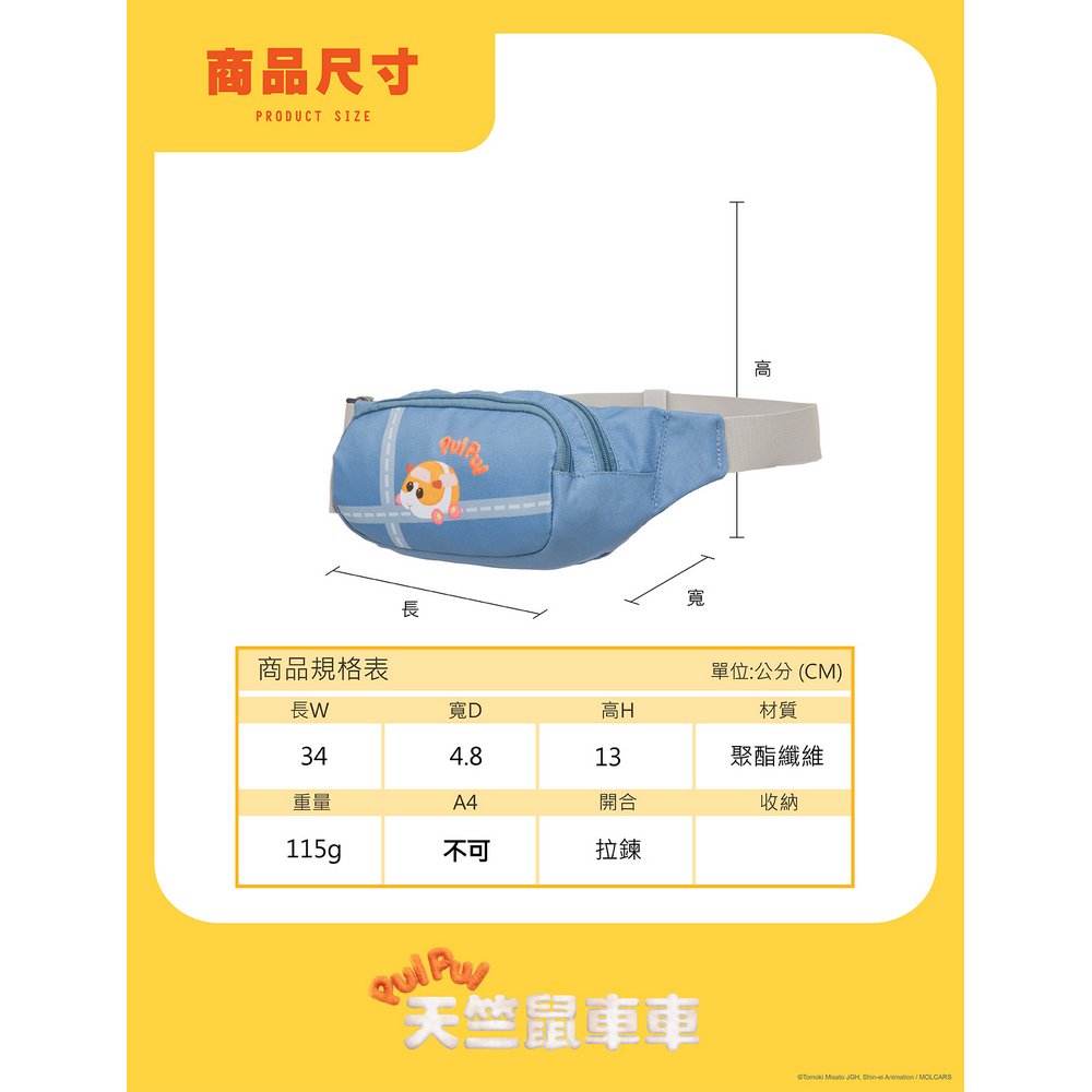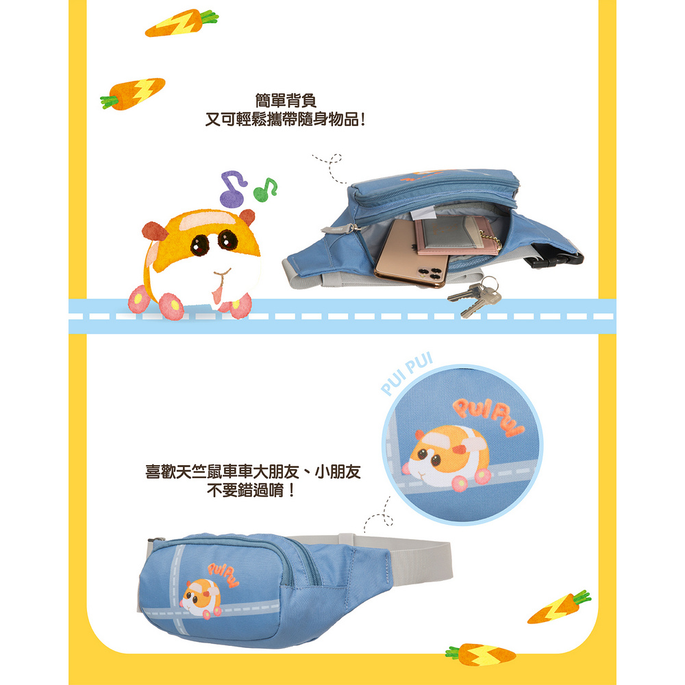商品特色PUI PUI 天竺鼠車車系列 圖樣印刷採用環保油墨背帶可調節長度,可斜背跟側背重量超輕量115g前口袋可放置隨身小物,便於取用天竺鼠車車是許多大小朋友的喜歡的卡通人物喔!你們知道「PUI PUI」英文字是代表天竺鼠車車的叫聲嗎!天竺鼠重要角色有【馬鈴薯】、【西羅摩】、【阿比】、【巧克力】、【泰迪】,喜歡呆萌的車車迷,趕快來蒐集喔!