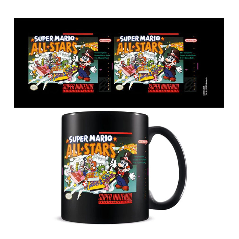 於1993年為紀念紅白機發售10周年所推出的紀念遊戲,超級瑪利歐全明星合輯,裡面共包含4款瑪利歐遊戲,此馬克杯便是以英文版封面作為主題設計,濃厚的魔術師風格非常符合瑪利歐多變的樣貌.適合喜愛瑪利歐的遊戲玩家們入手使用,在遊戲時搭配冷飲使用能讓身心皆能得到滿足.容量約為11OZ/315ML