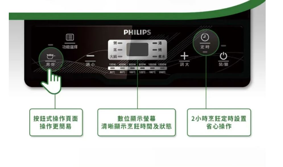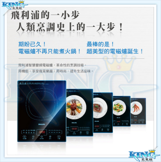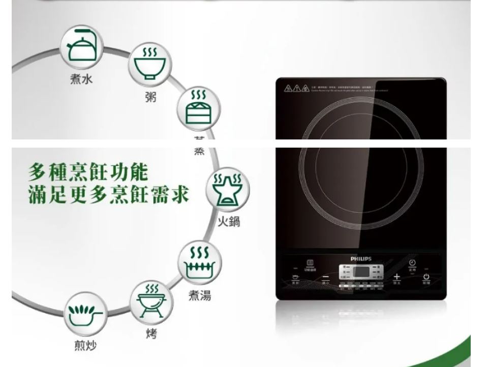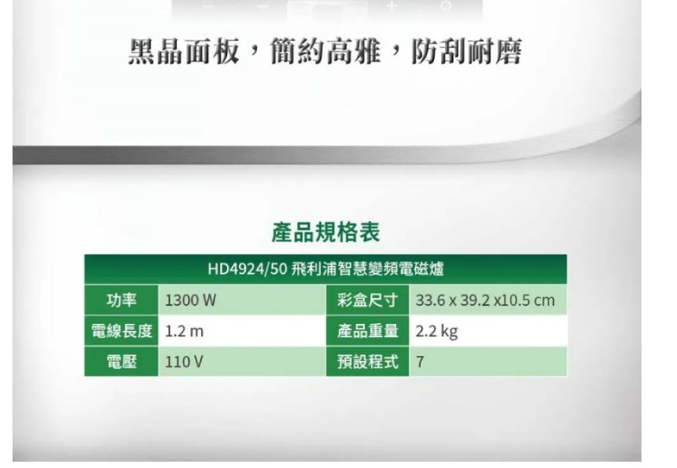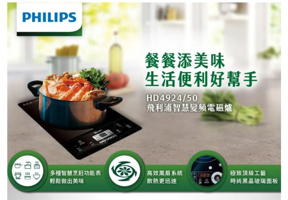 商品特色6檔火力選擇級別,可滿足更多烹飪需求7大烹飪功能(煎炒、烤、火鍋、煮湯、蒸、粥、煮水)2小時烹飪定時設置,省心操作 黑晶面板,簡約高雅,防刮耐磨一體式整板設計,全面防水,易於清潔 按鈕式操作介面,操作更簡易數位顯示幕清晰顯示烹飪時間及狀態煎炒功能可迅速到達最大火力額外的安全自動關熄功能無焰烹飪為您提供安全環境隔熱表面令烹飪更舒適,更安全商品規格品牌 PHILIPS飛利浦型號 HD4924 智慧變頻電磁爐類型 電磁爐顏色 黑色系產地 中國電壓 110V頻率 60Hz產品重量 約2.65kg保固 2年配件 說明書(含保證卡)消耗功率 1200W以上◆適用鍋具:不銹鋼鍋具,鐵鑄鍋具,鐵質炒菜平底鍋,不銹鋼煮水壺,鐵質煮水壺