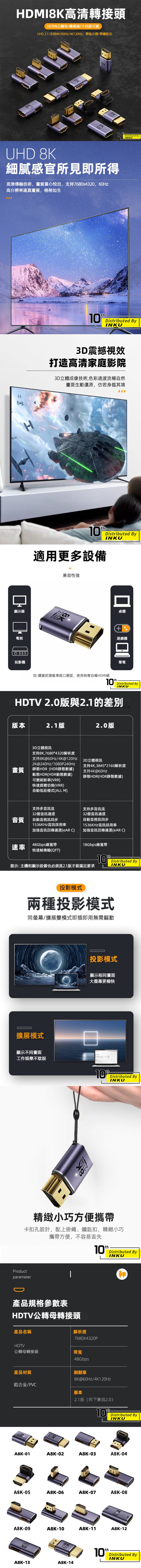 產品名稱:HDMI 公轉母轉接頭解析度:7680x4320P帶寬:48Gbps產品材質:鋁合金/PVC刷新率:8K@60Hz/4K120Hz版本:2.1版(向下兼容2.0)