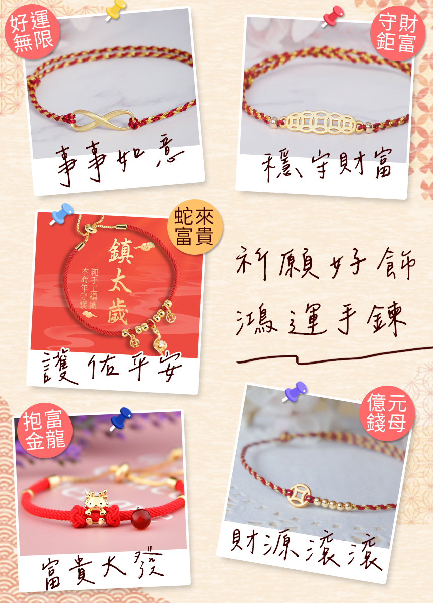 集結開運設計的金龍抱富鴻運手鍊以旺運紅繩為基底,結合財神爺最愛的顏色—「紅」與「金」,將這兩個顏色隨身配戴在手腕上,象徵受財神眷顧,財氣&鴻運雙倍加身護持。主體設計以生肖「龍」為靈感,龍充滿了生氣與力量,是尊貴、祥瑞的象徵,金龍懷抱紅線則寓意能夠旺財暴富,而龍的諧音「隆」,承載著鴻運興隆的美好祝願;再搭配雙財如意結與紅瑪瑙寶石,加倍活絡財氣並帶來好運。手鍊整體視覺別致可愛,讓開運充滿療癒的生活趣味!