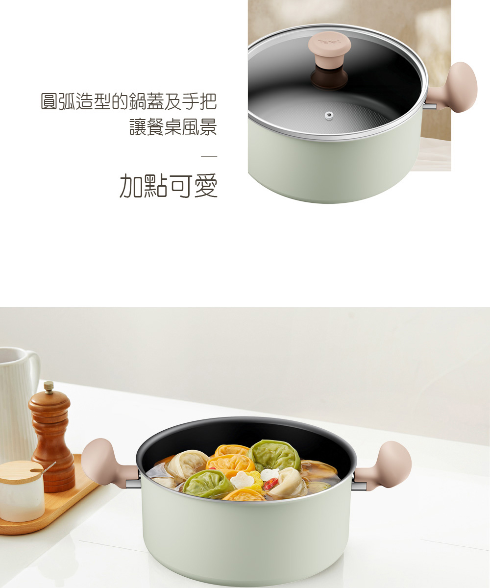 ◆抹茶拿鐵和香草冰淇淋撞色鍋具,讓料理時光也可愛起來了!◆TITANIUM鈦合金強化塗層科技,獨家研發塗層,添加鈦合金微粒子,優異的耐磨、抗刮性,不沾效果佳又好清洗。◆煮湯前可先在鍋內把配料炒勻,不黏鍋,讓準備湯品一鍋就可以完成。◆特快傳熱底部技術+感應面積+10mm,導熱更快更均勻,讓料理快速美味。◆電磁爐感應技術,加熱快速,省時節能。◆獨家佳溫紅心技術,180°C時紅心會改變顏色,熱鍋完成一看即知。◆不含PFOA、重金屬,安全無毒,經法國國家認可機構檢定,符合法國及歐洲鍋具安全規定。◆透明耐熱玻璃蓋,輕鬆觀察鍋內烹煮狀況,還可避免水氣、油污飛濺。◆可冷鍋冷油或無油料理烹調,享受美味的同時不會攝入過多的油脂。◆PTFE不沾處理的防沾抗污鍋身,可放入洗碗機,適合忙碌現代家庭使用。◆可吊掛收納,更彈性方便。