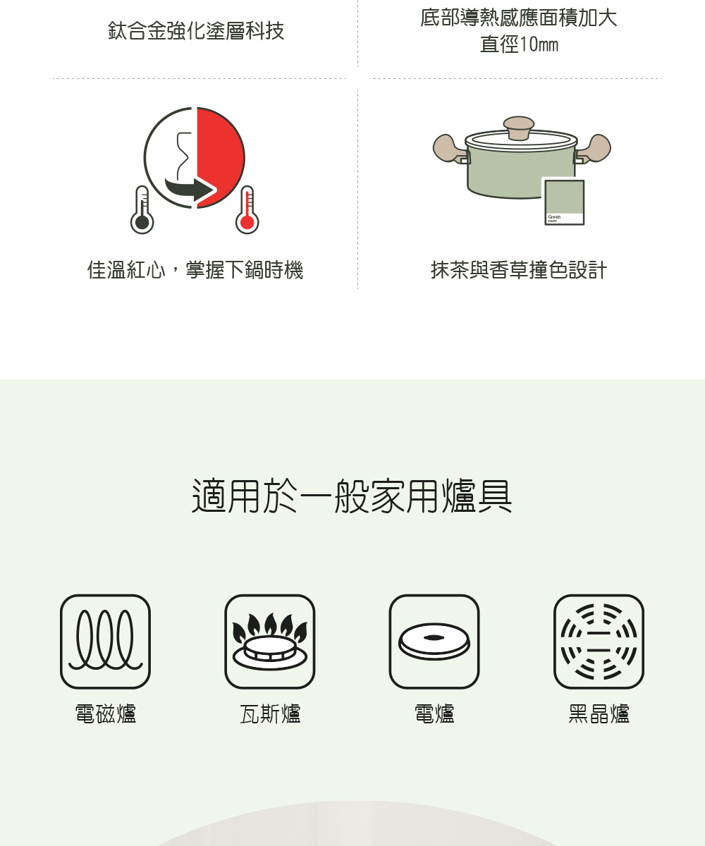 **貼心提醒**—適用於一般家用爐具:瓦斯爐、黑晶爐、紅外線爐、電爐、鹵素爐、電磁爐。—請使用木鏟、筷子、矽膠或塑膠製耐熱鍋鏟,常保塗層最佳效果。