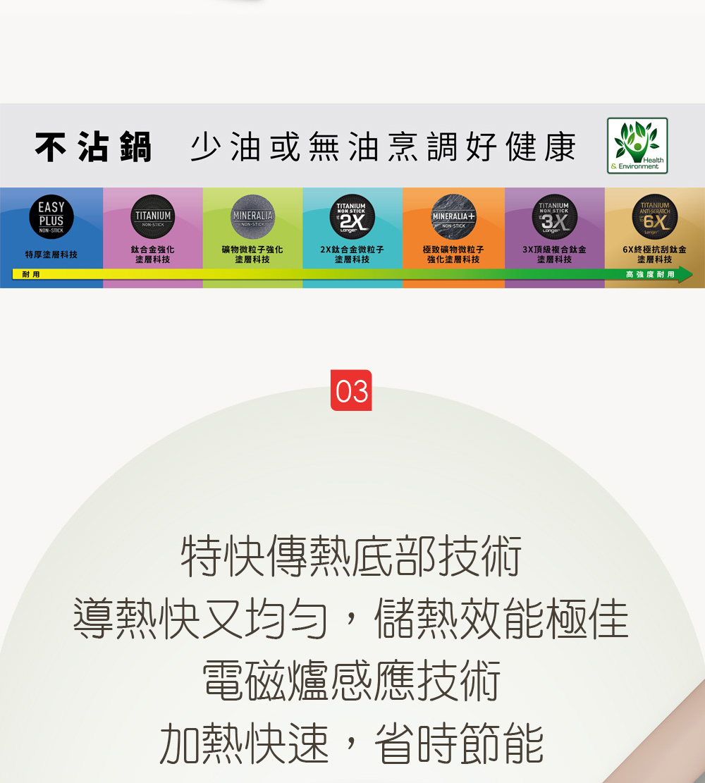 **貼心提醒**—適用於一般家用爐具:瓦斯爐、黑晶爐、紅外線爐、電爐、鹵素爐、電磁爐。—請使用木鏟、筷子、矽膠或塑膠製耐熱鍋鏟,常保塗層最佳效果。