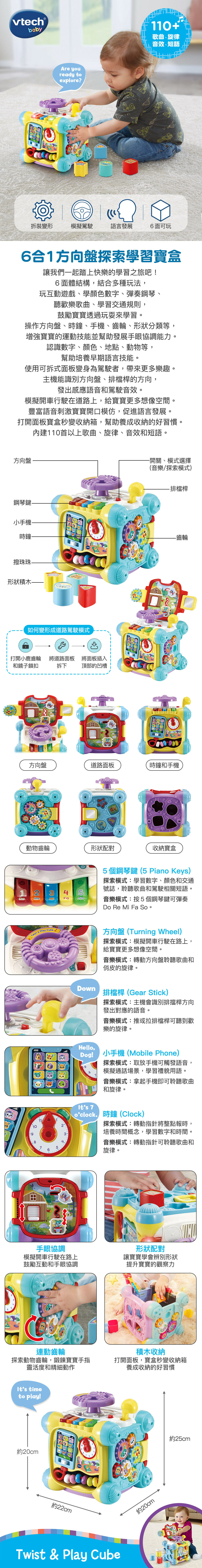 讓我們一起踏上快樂的學習之旅吧!6面體結構,結合多種玩法,玩互動遊戲、學顏色數字、彈奏鋼琴、聽歡樂歌曲、學習交通規則,鼓勵寶寶透過玩耍來學習。操作方向盤、時鐘、手機、齒輪、形狀分類等, 增強寶寶的運動技能並幫助發展手眼協調能力。認識數字、顏色、地點、動物等,幫助培養早期語言技能。使用可拆式面板變身為駕駛者,帶來更多樂趣。主機能識別方向盤、排檔桿的方向,發出感應語音和駕駛音效。模擬開車行駛在道路上,給寶寶更多想像空間。豐富語音刺激寶寶開口模仿,促進語言發展。打開面板寶盒秒變收納箱,幫助養成收納的好習慣。內建110首以上歌曲、旋律、音效和短語。