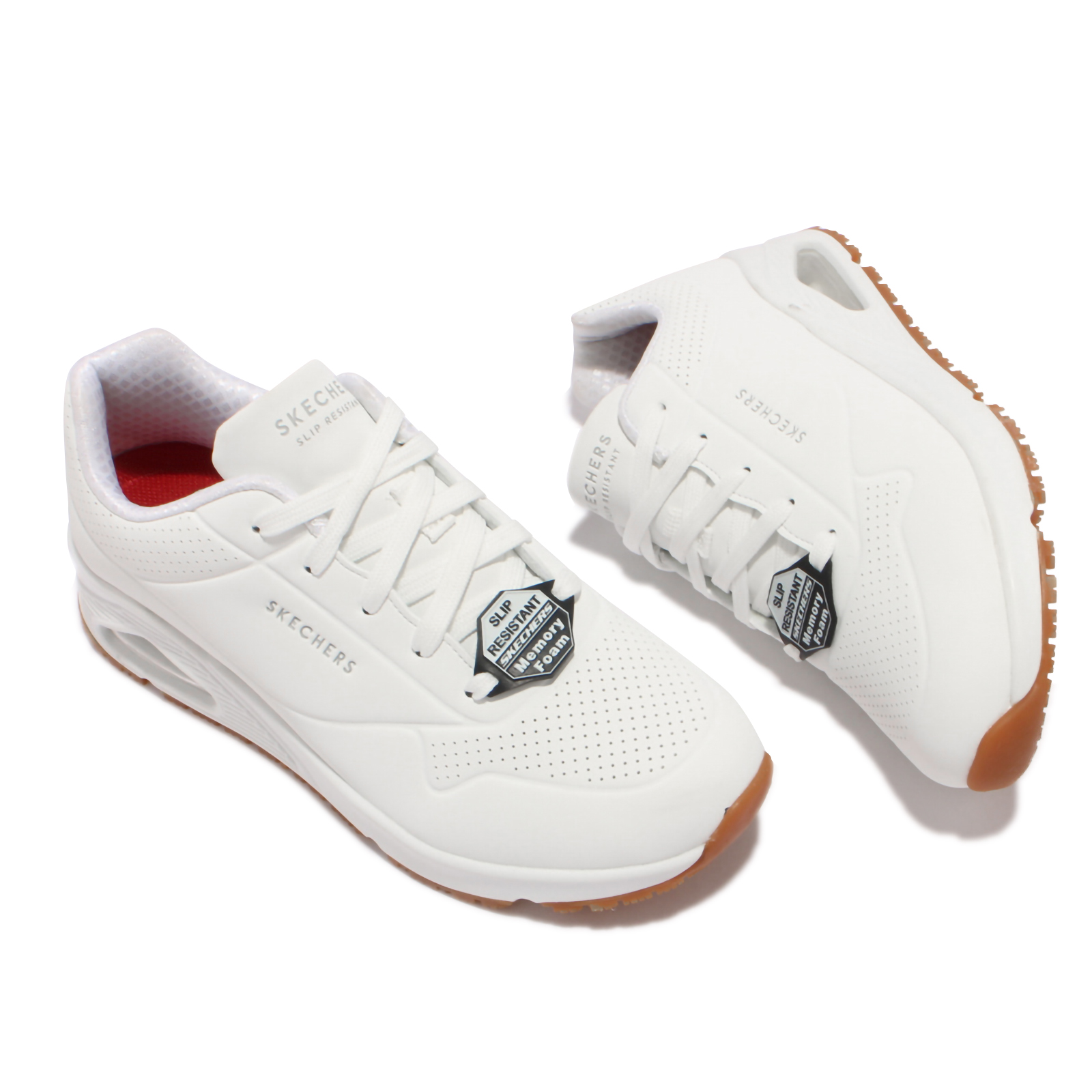 品牌: SKECHERS型號: 108021-WHT品名: Uno SR*繫帶休閒運動型防滑工作運動牛津鞋 *輕鬆地將舒適、時尚和安全結合在一起。光滑耐用的合成鞋面,繫帶休閒運動型工作防滑運動牛津鞋,飾有壓紋和穿孔裝飾。氣墊鞋跟,記憶泡沫鞋墊。 *SKECHERS 防滑牽引外底 *防滑鞋底也耐油 *電氣危險 (EH) 安全設計 *EH 安全設計測試 ASTM F2892-11 *光滑耐用的合成鞋面 *正面和側面飾有經典 Uno 風格壓花細節
