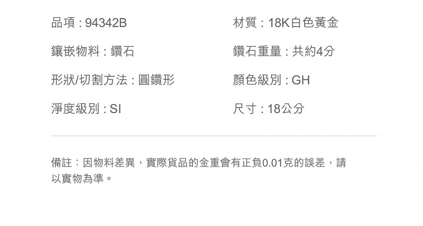 ‧款號:94342B‧材質:18K白色黃金‧鑲嵌物料:鑽石