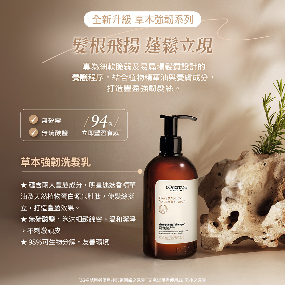 髮根飛揚 蓬鬆立現草本強韌系列.全新升級上市!針對細軟扁塌、脆弱易斷髮質精心設計。蘊含兩大豐髮明星「迷迭香精華油」、「源米胜肽」,全新活性成分能瞬間打造豐厚髮感,讓秀髮更具立體感與支撐力!全面提升秀髮豐盈厚實感,打造健康頭皮、養出強韌秀髮!