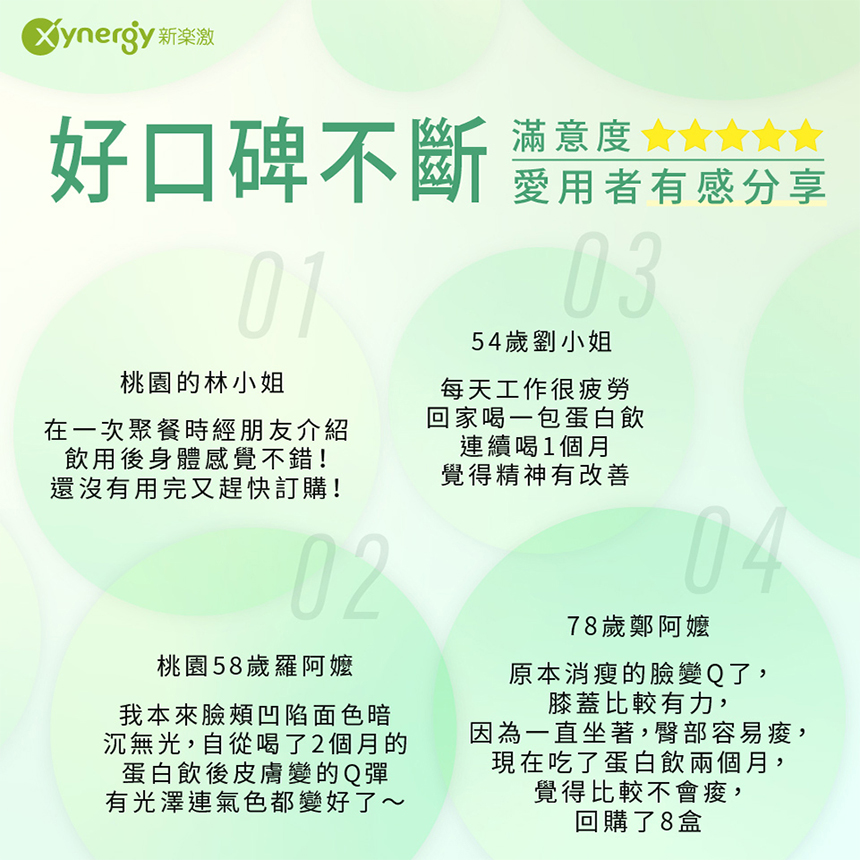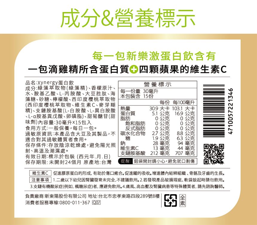 品名:Xynergy蛋白飲成分:綠藻萃取物(綠藻精)、香檬原汁、水、胺基乙酸、L-丙胺酸、大豆胜肽、海藻糖、砂糖、檸檬酸、西印度櫻桃萃取物(西印度櫻桃萃取物、維生素C、麥芽糊精)、支鏈胺基酸(L-白胺酸、L-異白胺酸、L-α胺基異戊酸、卵磷魯)、甜菊醣苷(甜味劑)內容量:30毫升×15包入保存期限:未開封24個月有效日期:標示於包裝(西元年.月.日)保存條件:存放陰產乾燥處,避免陽光照射、高溫及潮濕處。食用方式:一般保養,每日一包。過敏原資訊:本產品含大豆及其製品,不適合對其過敏體質者食用。