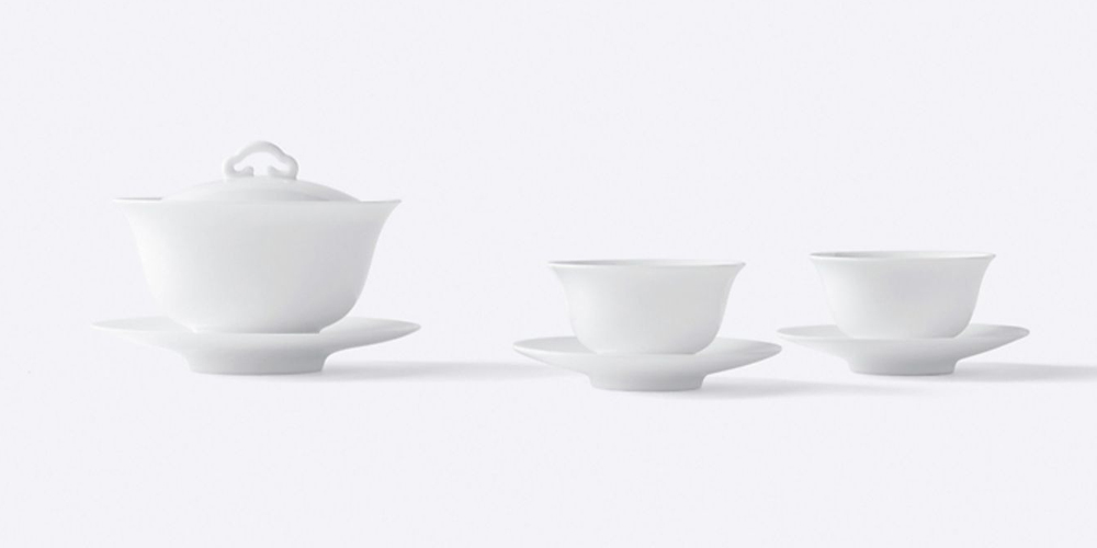 內部將全套白瓷蓋碗、茶杯、杯托嵌入架上,
